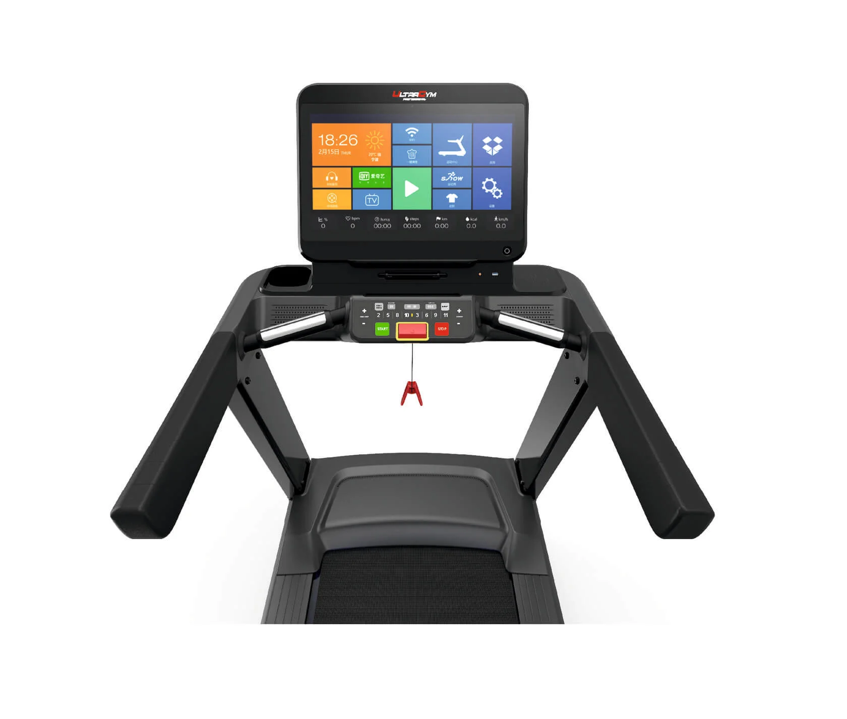 Управление беговой дорожкой интуитивно понятно, как для опытного пользователя, так и для новичка и осуществляется с помощью клавиш расположенных на консоли. Кроме того, модель UG-POWER 010 имеет увеличенный Touch Screen дисплей диагональю 21,5" на котором можно отслеживать такие показатели как: скорость, пульс, дистанцию, наклон, время и калории. Информативный экран, удобный алгоритм выбора программ, а также клавиши быстрого выбора скорости и наклона сделают тренировку максимально комфортной и позволят не отвлекаться на управление.