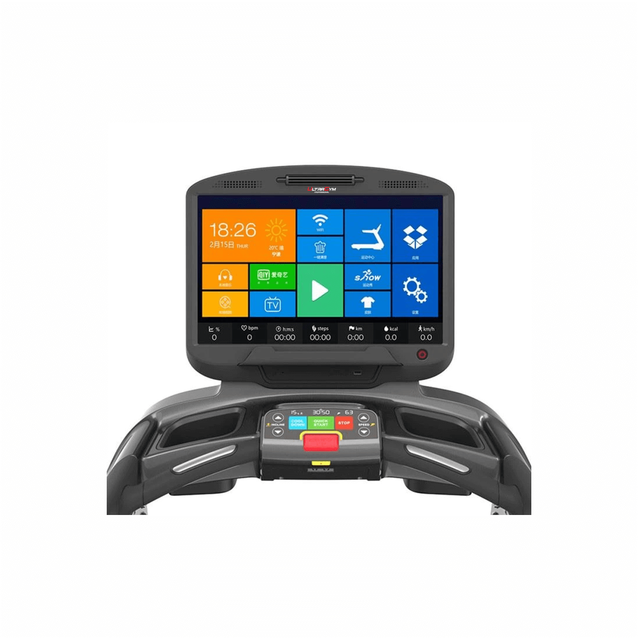 Управление беговой дорожкой интуитивно понятно, как для опытного пользователя, так и для новичка и осуществляется с помощью клавиш расположенных на консоли. Кроме того, модель UG-POWER 012 имеет 18.5"TFT Touch Screen дисплей на котором можно отслеживать такие показатели как: скорость, пульс, дистанцию, наклон, время и калории и установленные программы.
