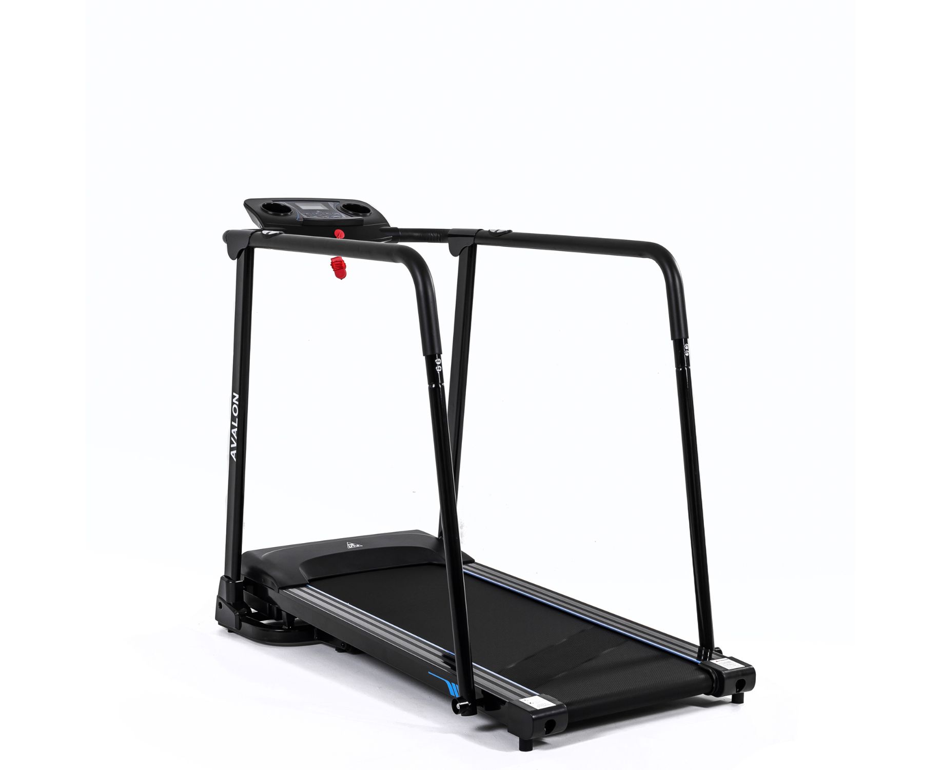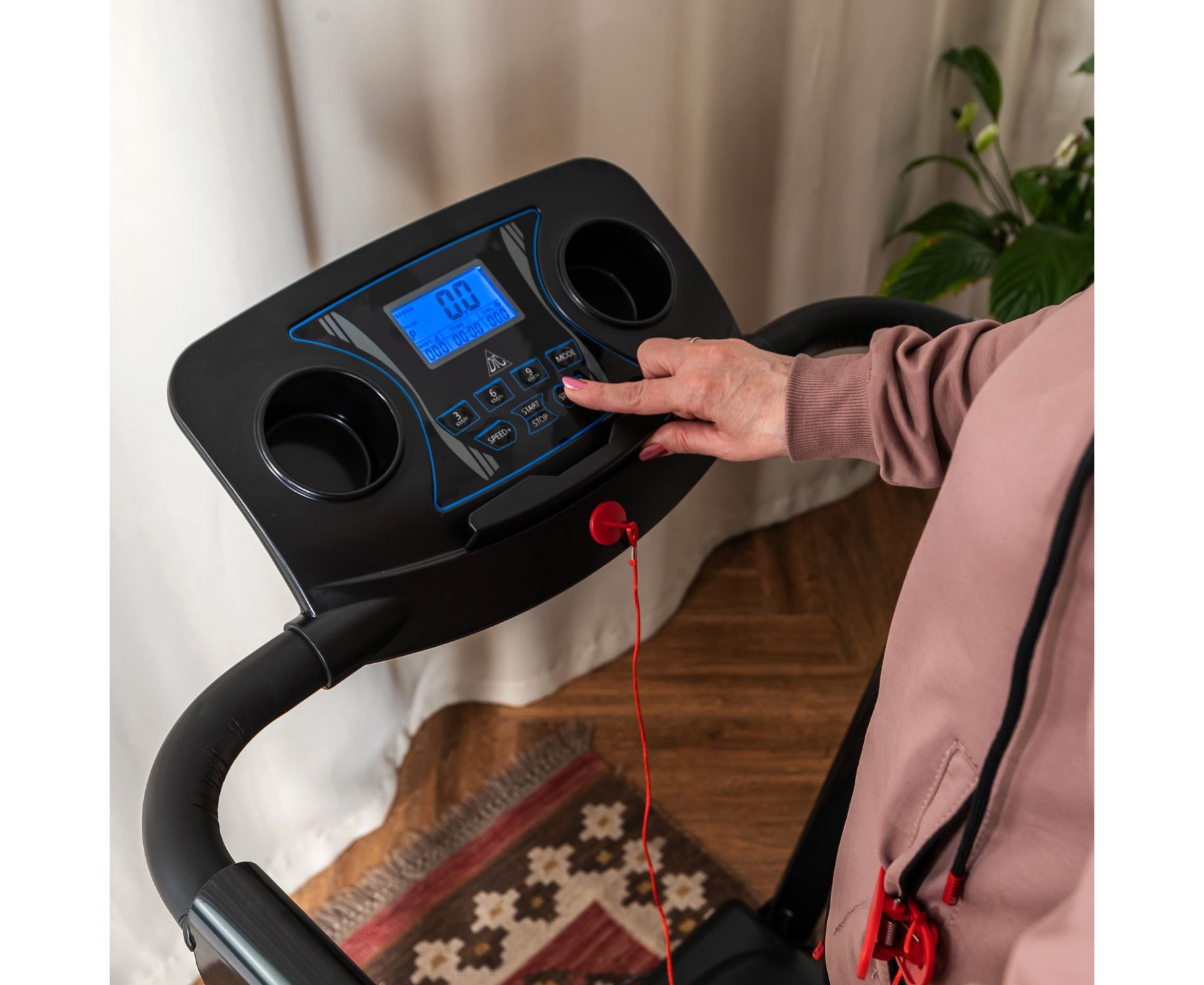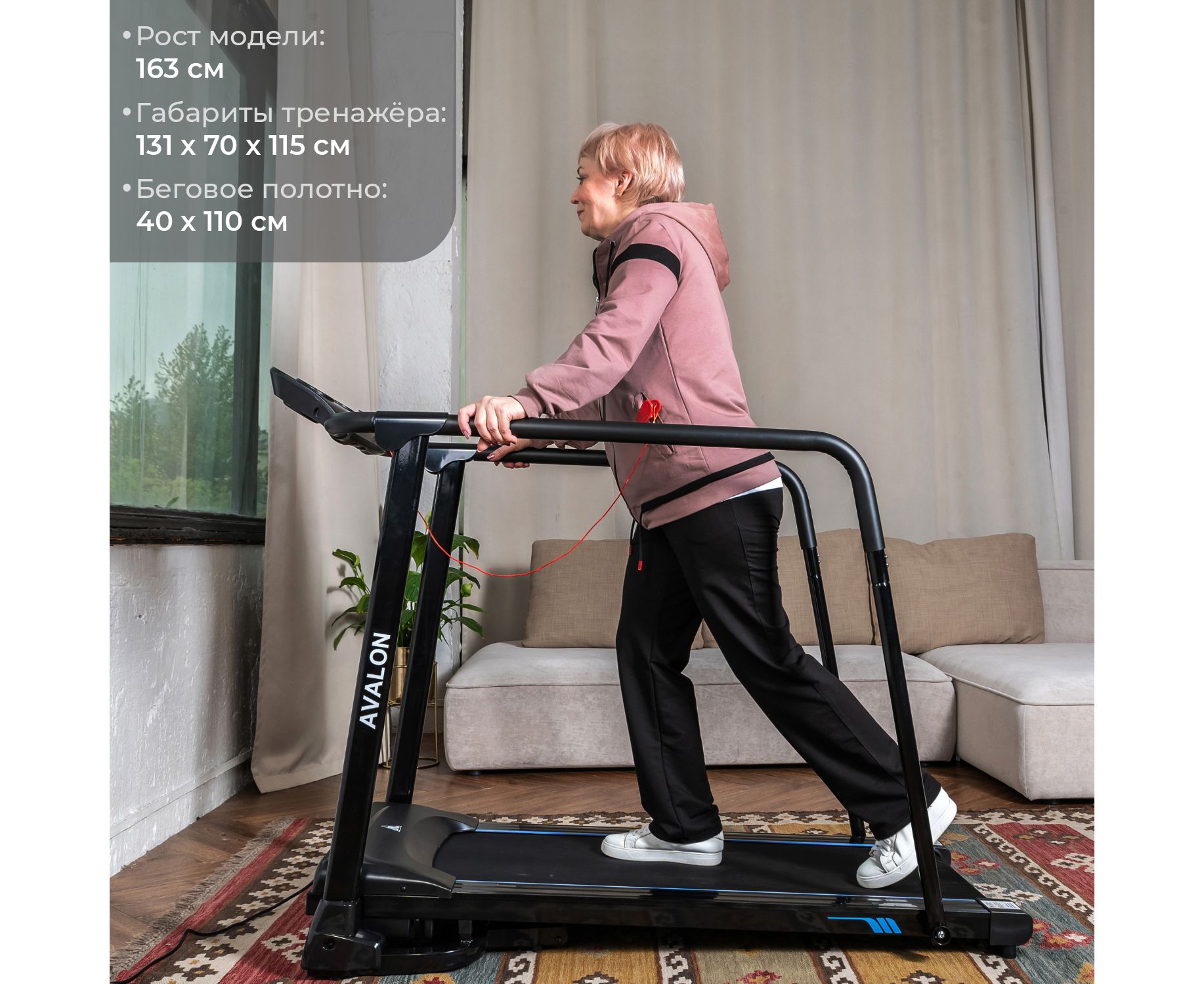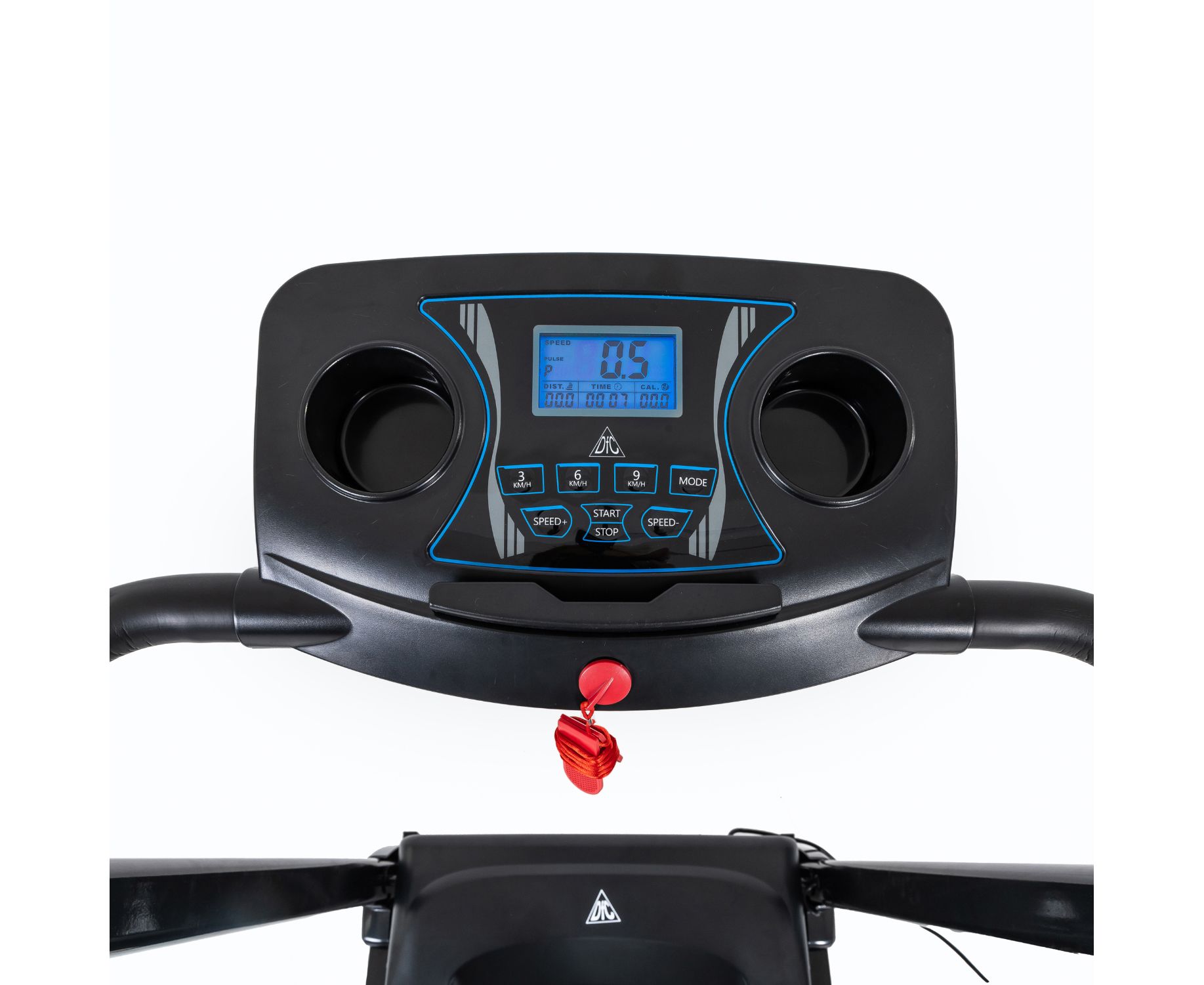 Дорожка с поручнями для реабилитации, на которых располагаются сенсорные датчики пульса. В комплекте ключ безопасности для аварийной остановки. На консоли расположены держатель для планшета и 2 подстаканника, а также ЖК-дисплей с голубой подсветкой. Дисплей отображает такие параметры как скорость, время, расстояние, пульс и калории.
