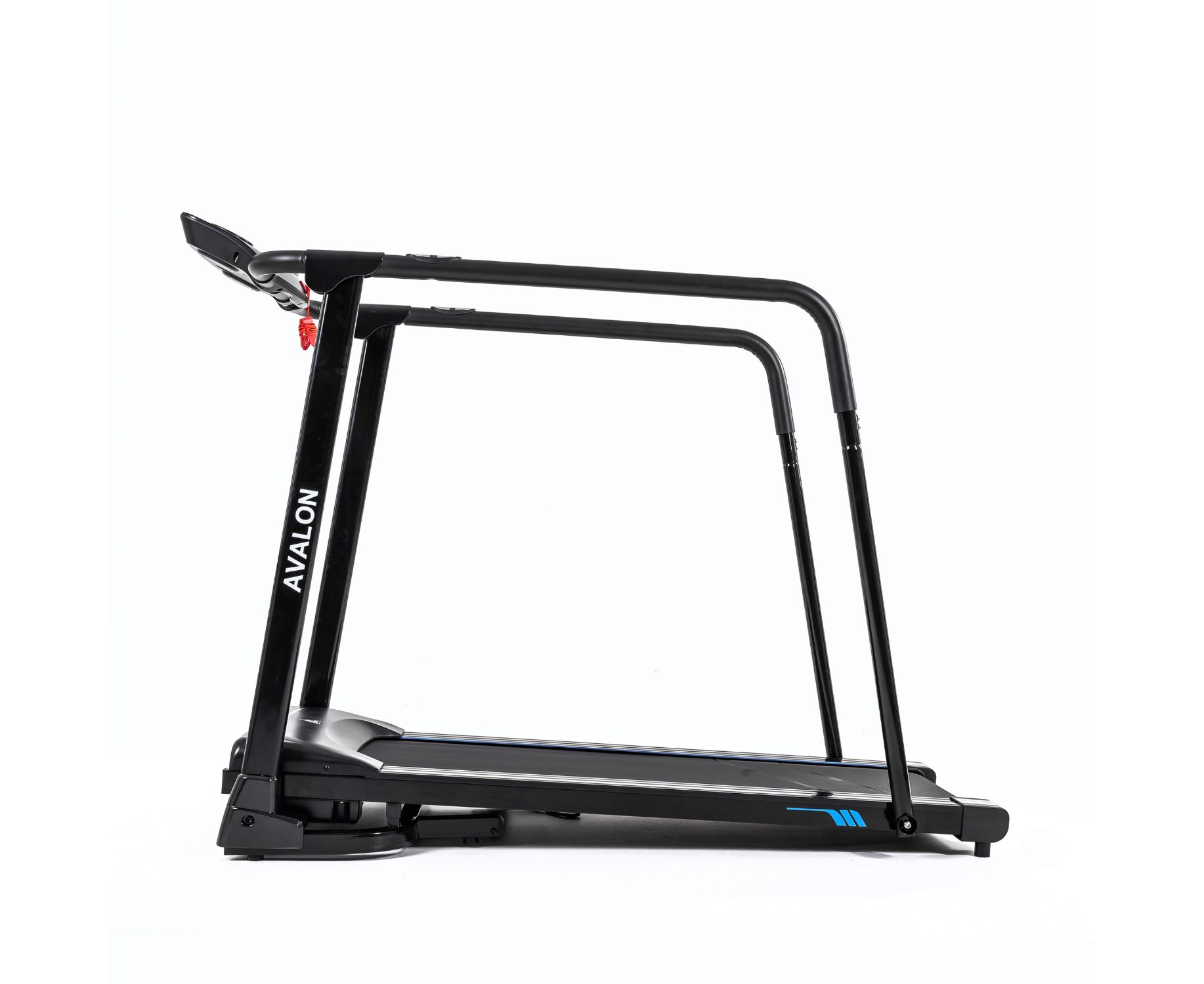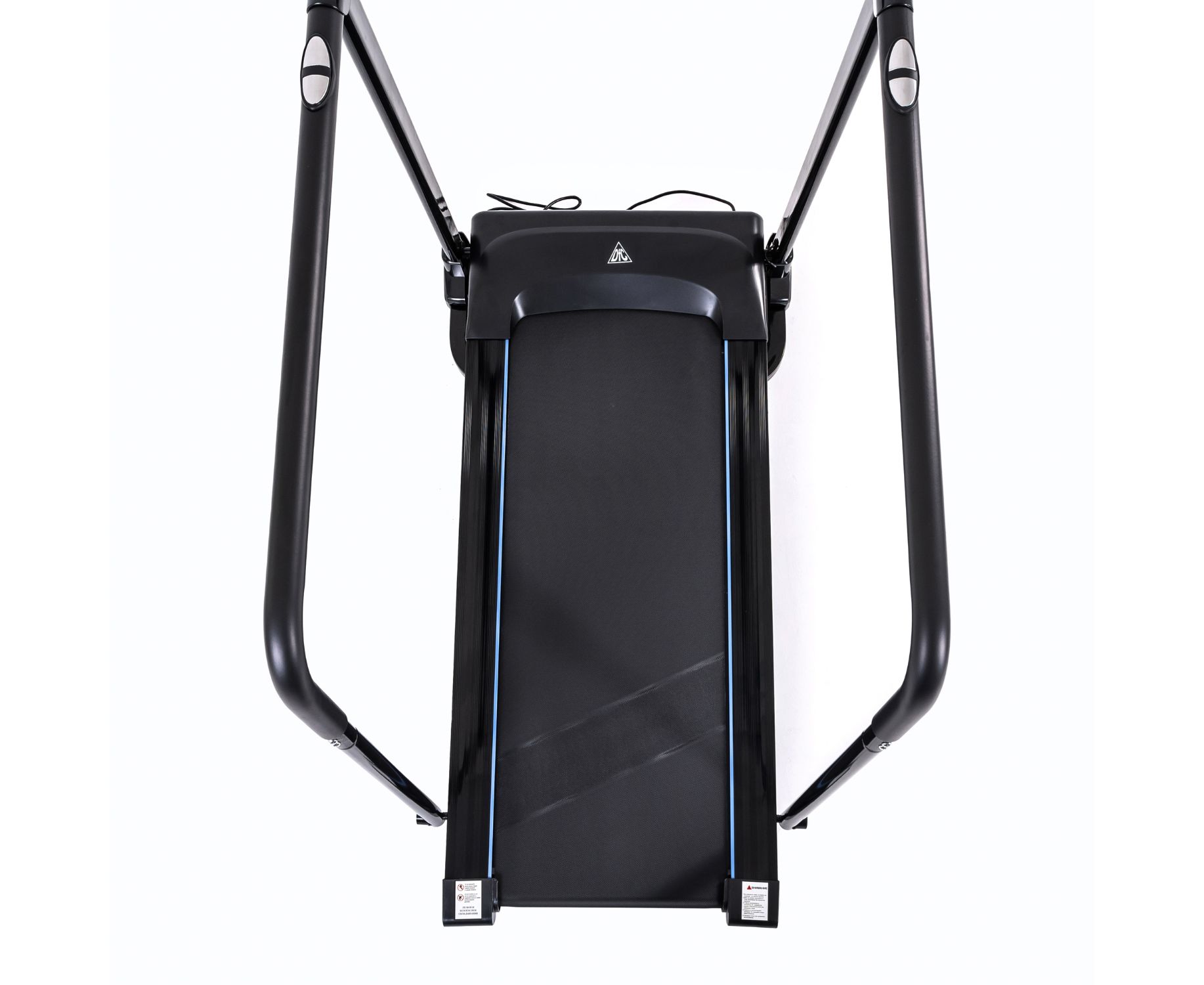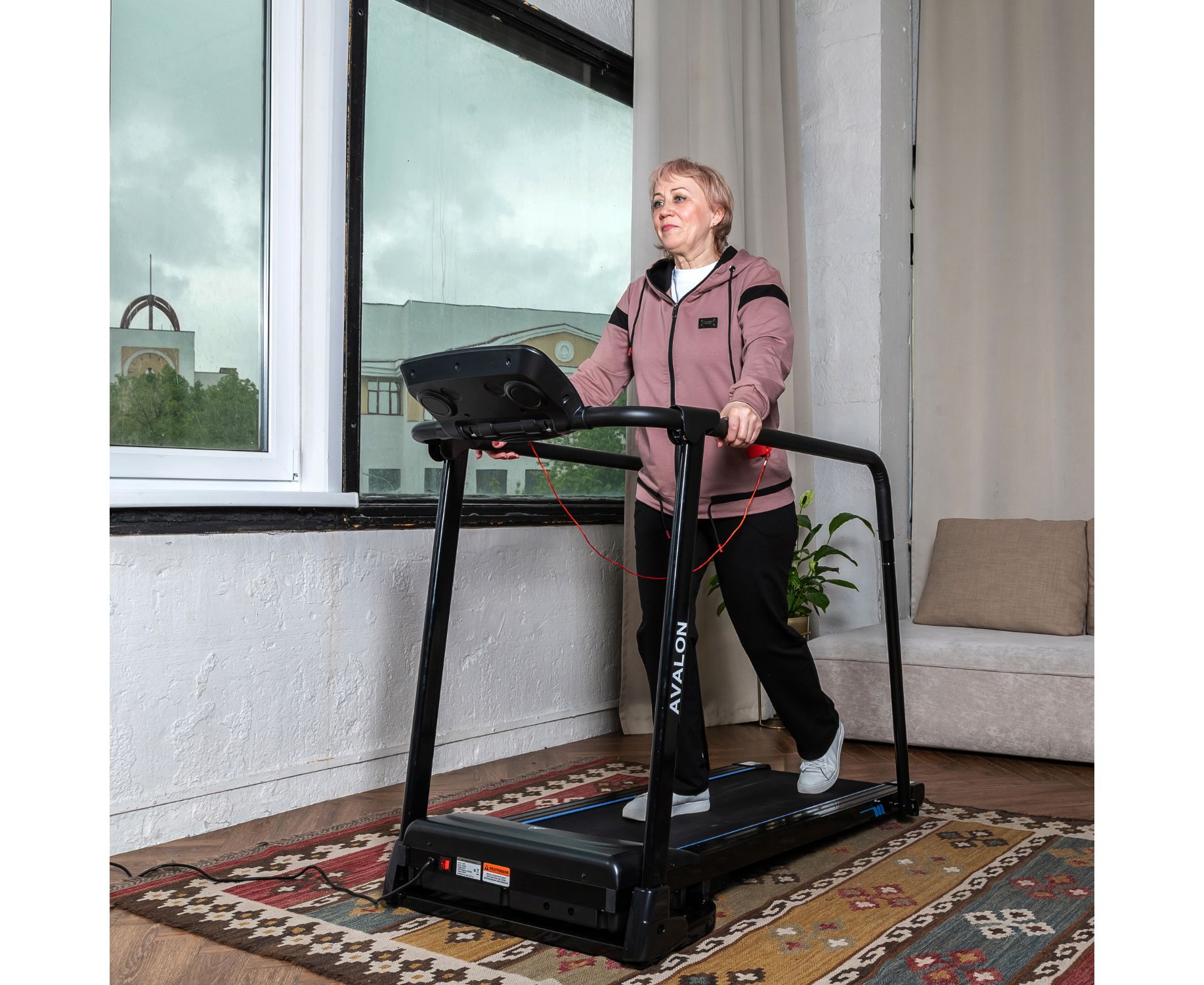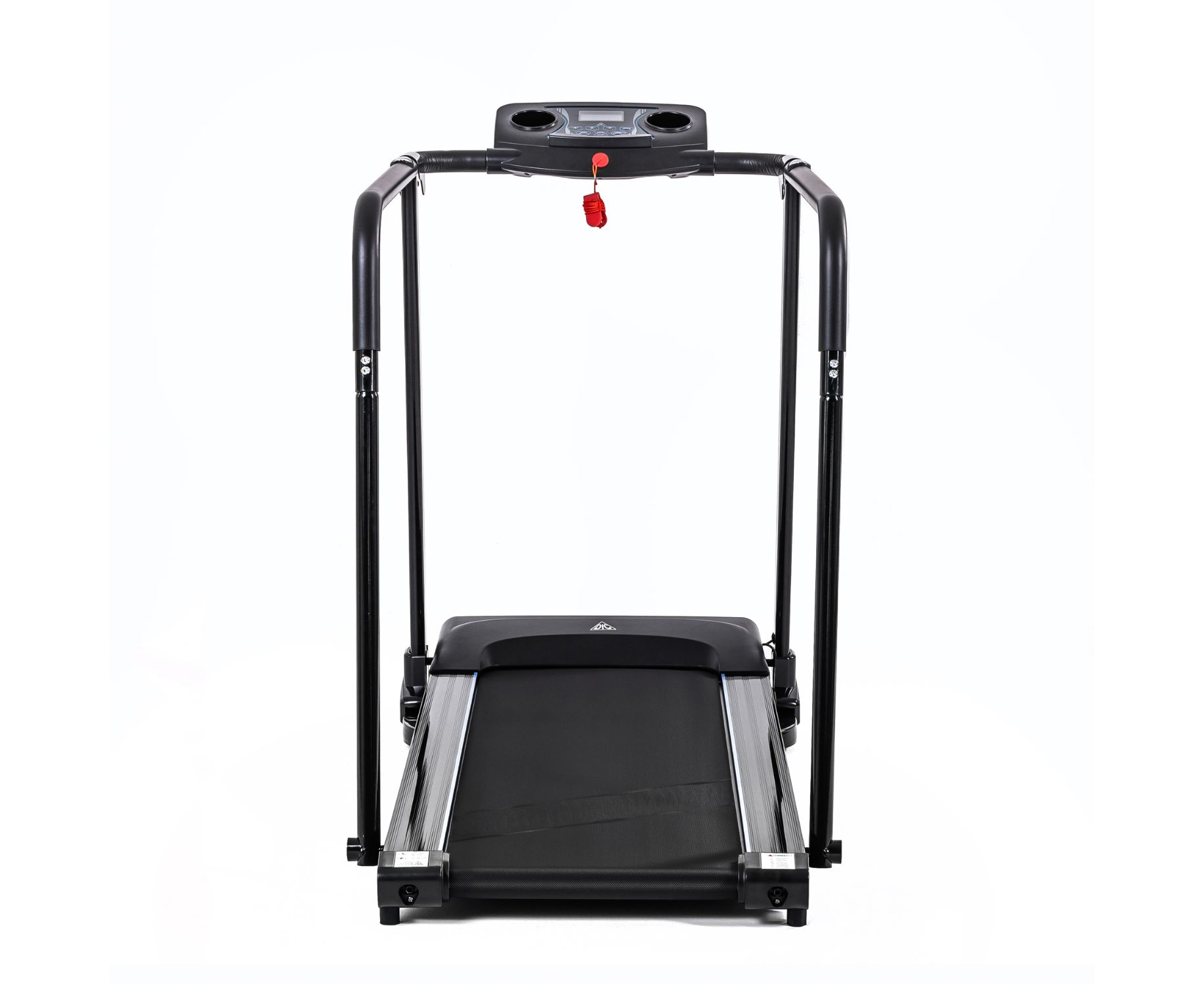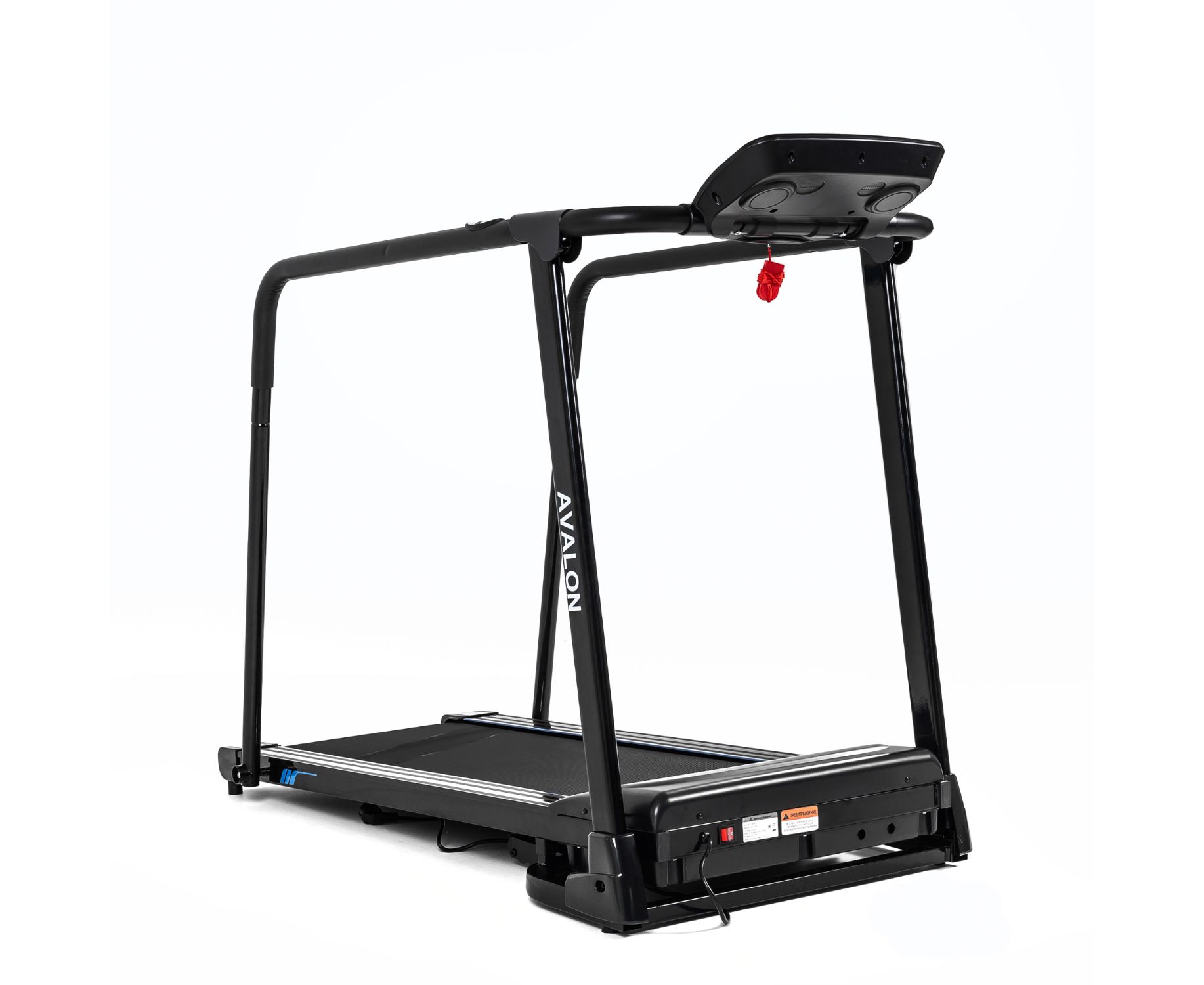 Дорожка с поручнями для реабилитации, на которых располагаются сенсорные датчики пульса. В комплекте ключ безопасности для аварийной остановки. На консоли расположены держатель для планшета и 2 подстаканника, а также ЖК-дисплей с голубой подсветкой. Дисплей отображает такие параметры как скорость, время, расстояние, пульс и калории.