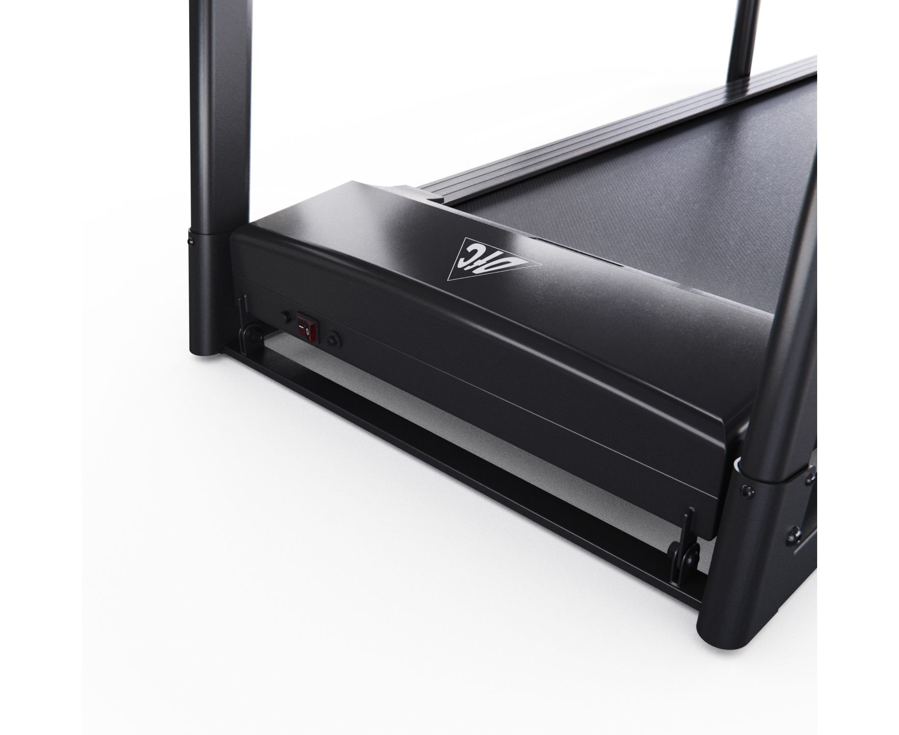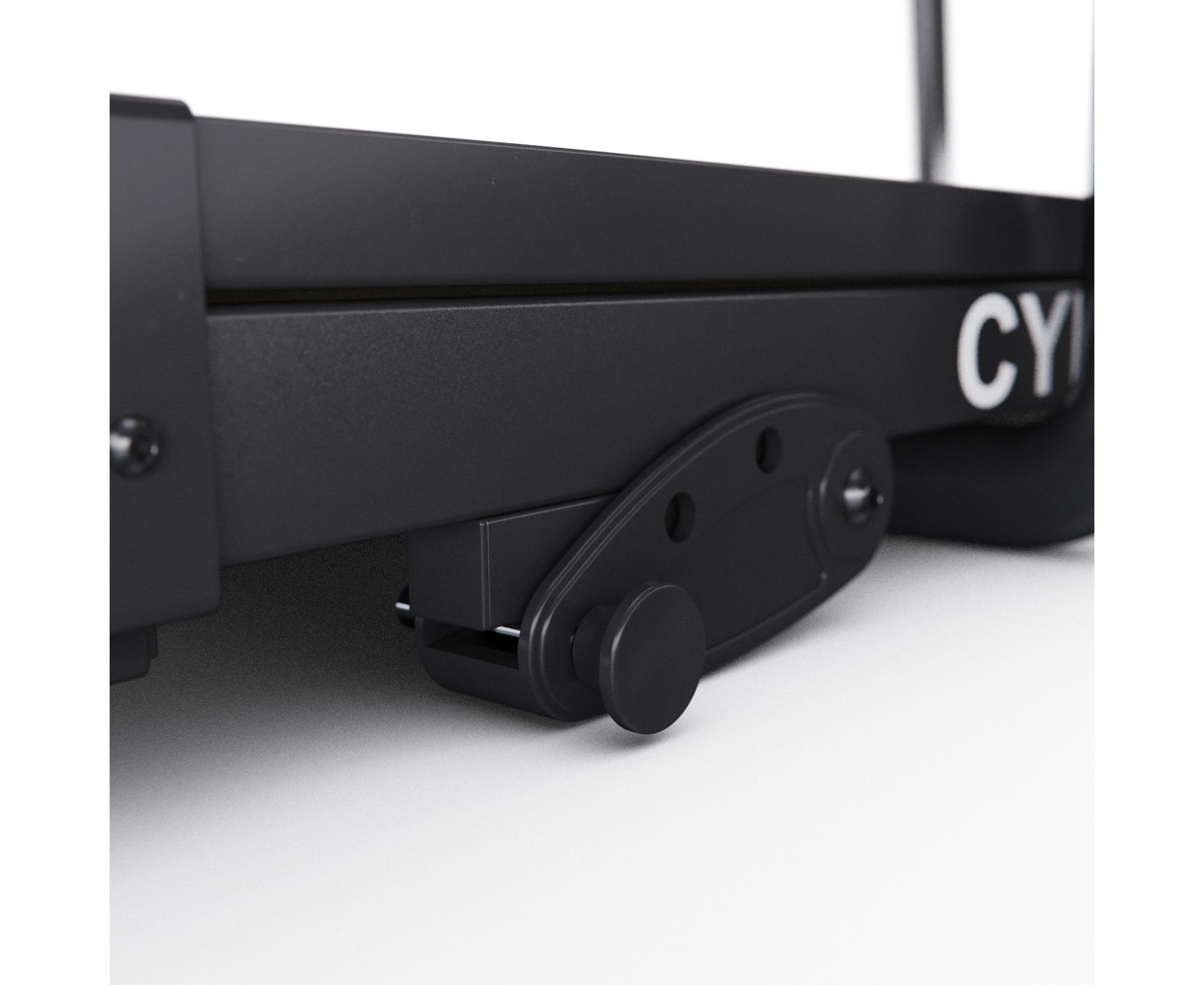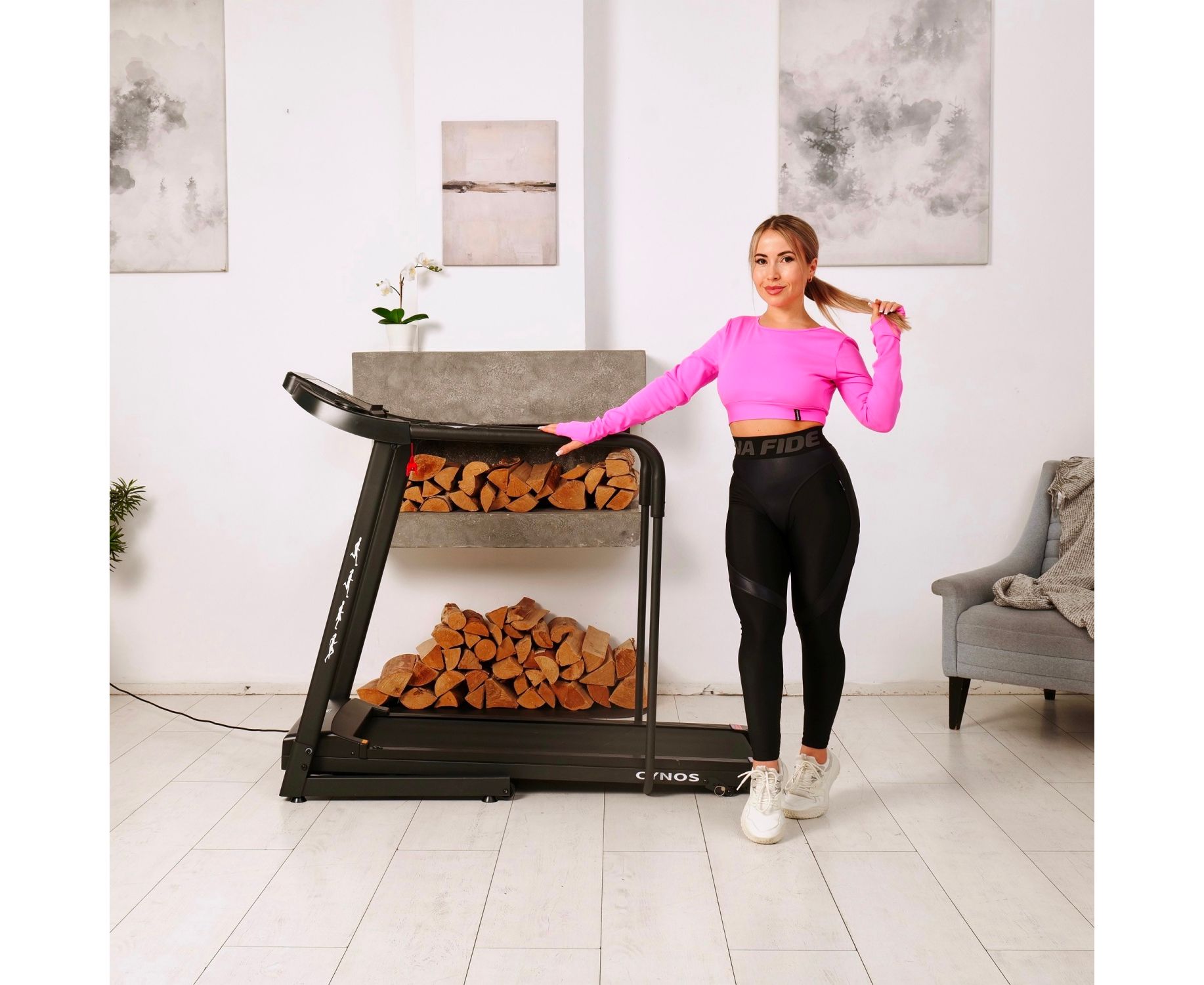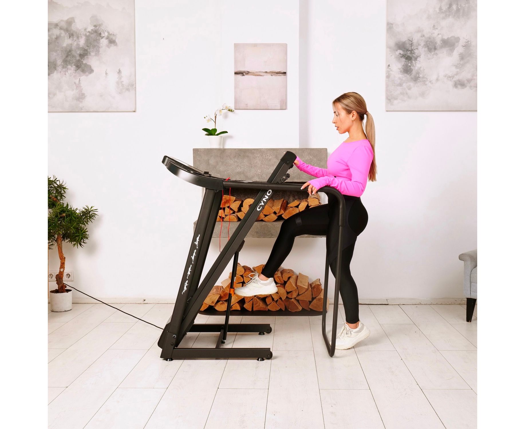 Беговая дорожка CYNOS имеет складную конструкцию. В сложенном виде она занимает минимум места, что удобно для небольших квартир. Есть два варианта хранения: с поручнями или без них. Первый подходит, если нужно регулярное использование дорожки. Во втором случае поручни снимаются для более длительного и компактного хранения (например, в кладовой). Транспортировочные ролики позволяют легко перемещать её при необходимости.