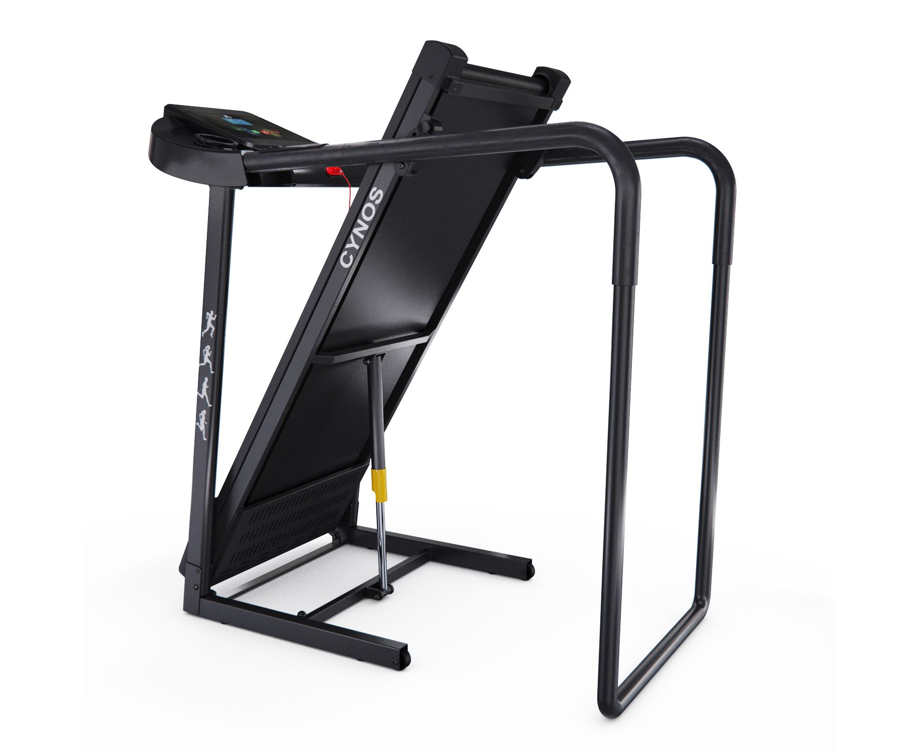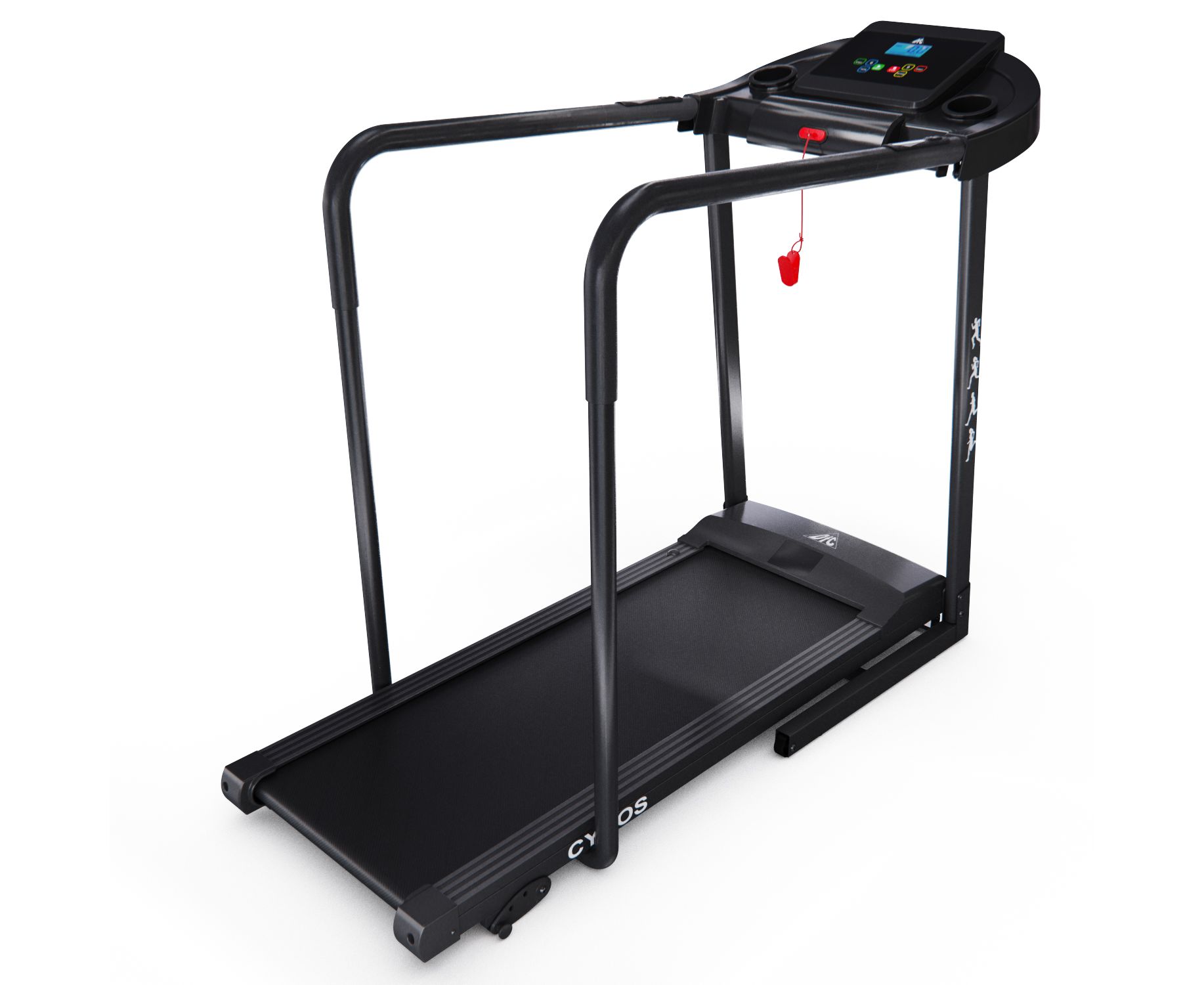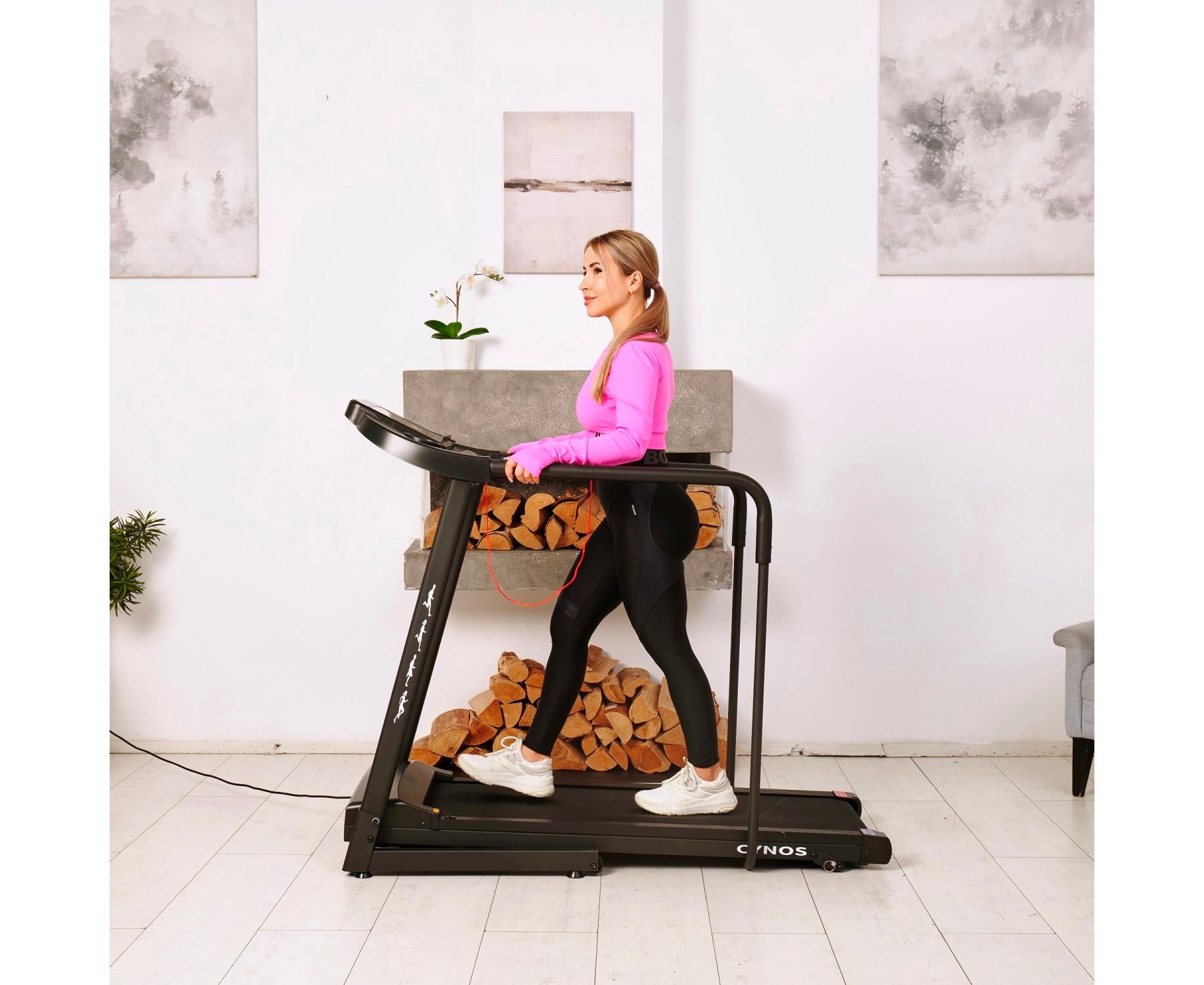 CYNOS — электрическая беговая дорожка чёрного цвета для домашнего применения и использования в спортивных и реабилитационных целях. Модель отличается присутствием в комплектации специальных удлинённых поручней для реабилитационных занятий, возможностью регулировки наклона бегового полотна в трёх положениях.