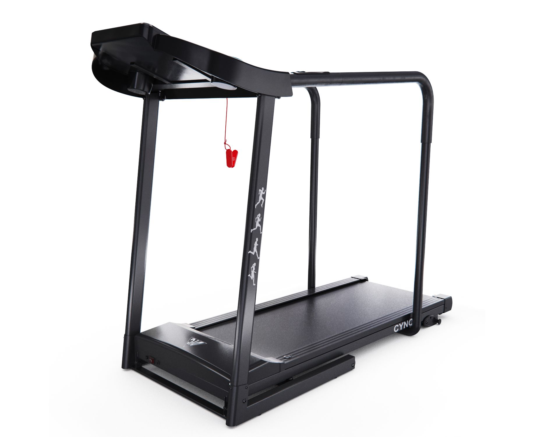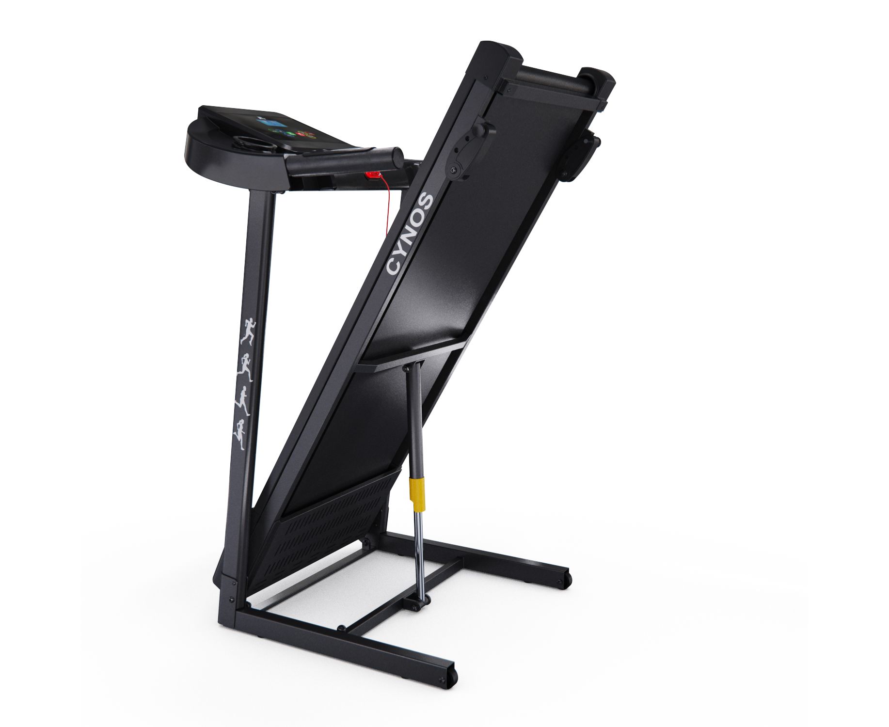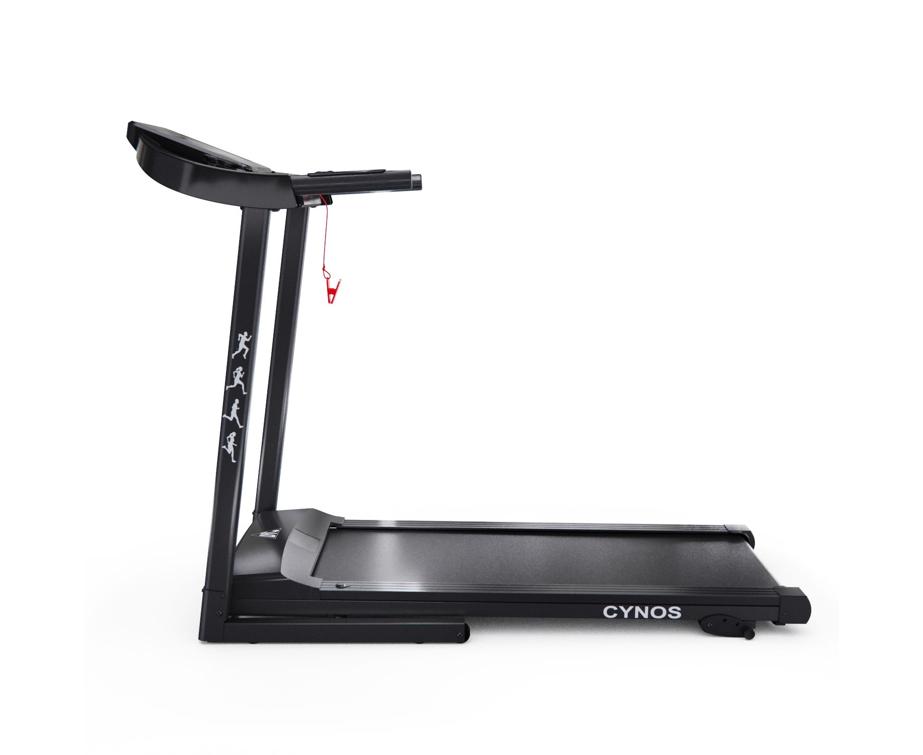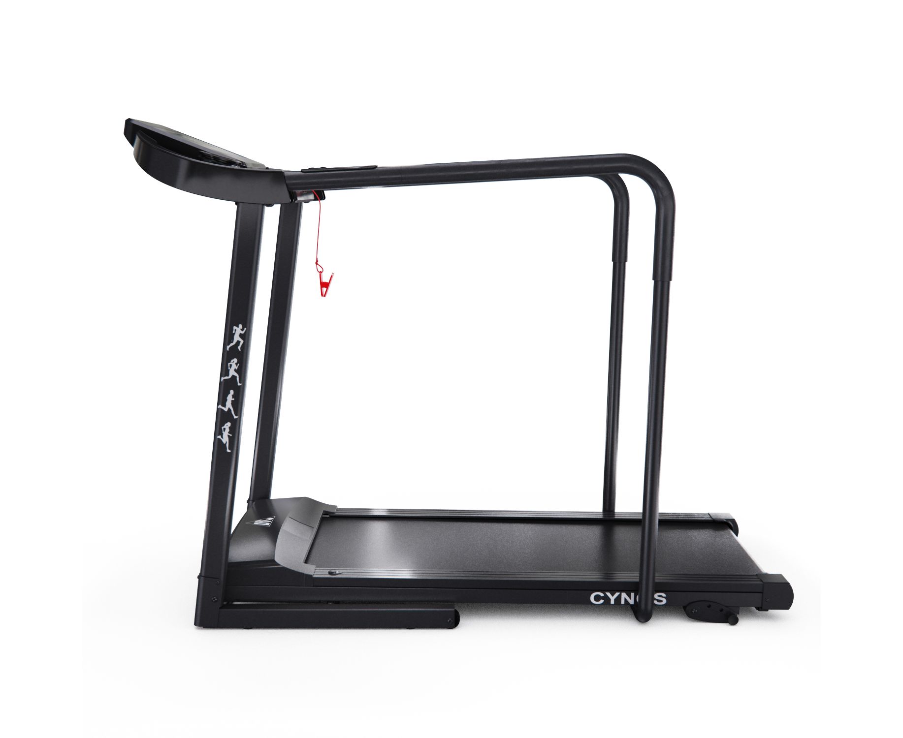CYNOS — электрическая беговая дорожка чёрного цвета для домашнего применения и использования в спортивных и реабилитационных целях. Модель отличается присутствием в комплектации специальных удлинённых поручней для реабилитационных занятий, возможностью регулировки наклона бегового полотна в трёх положениях.