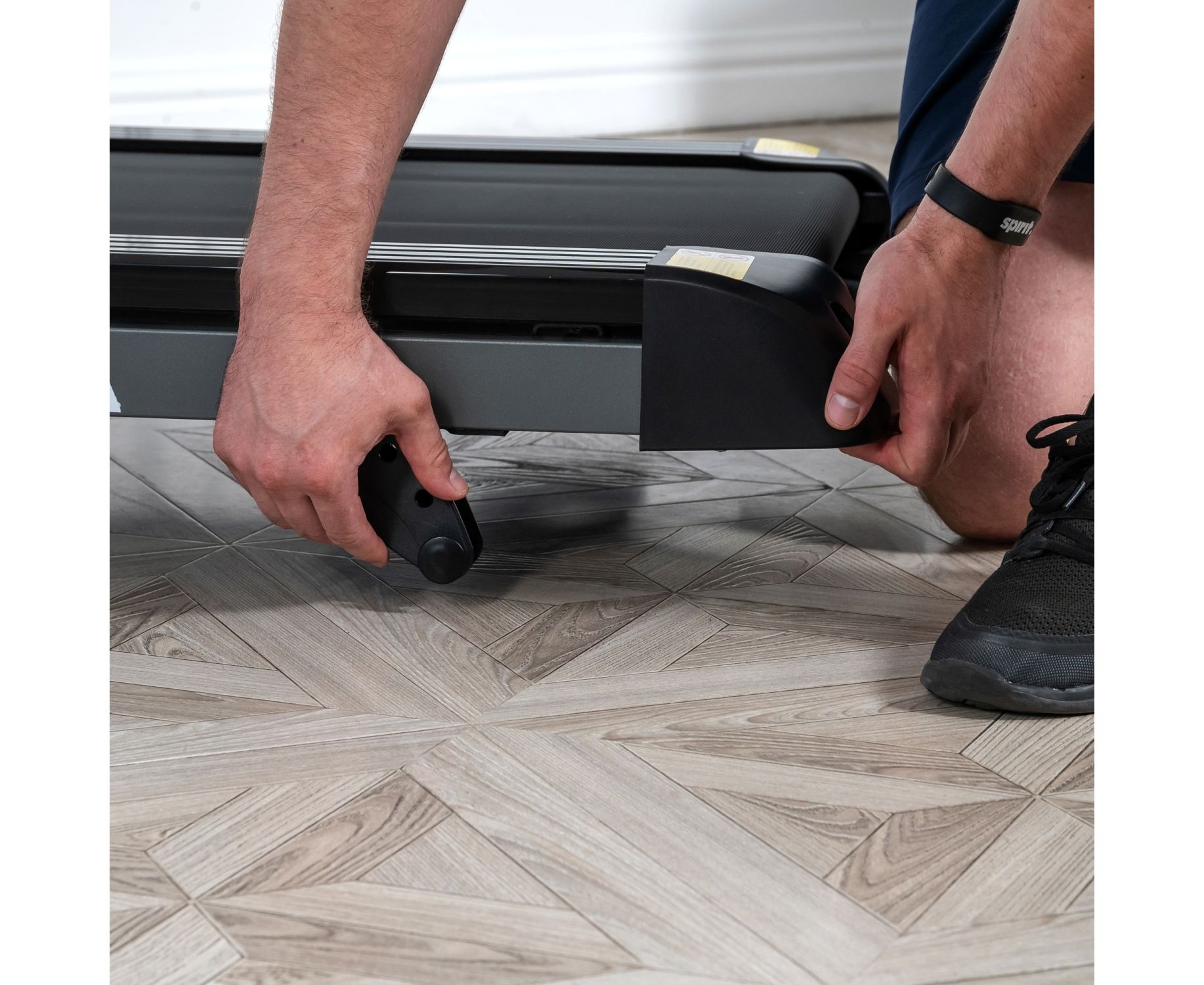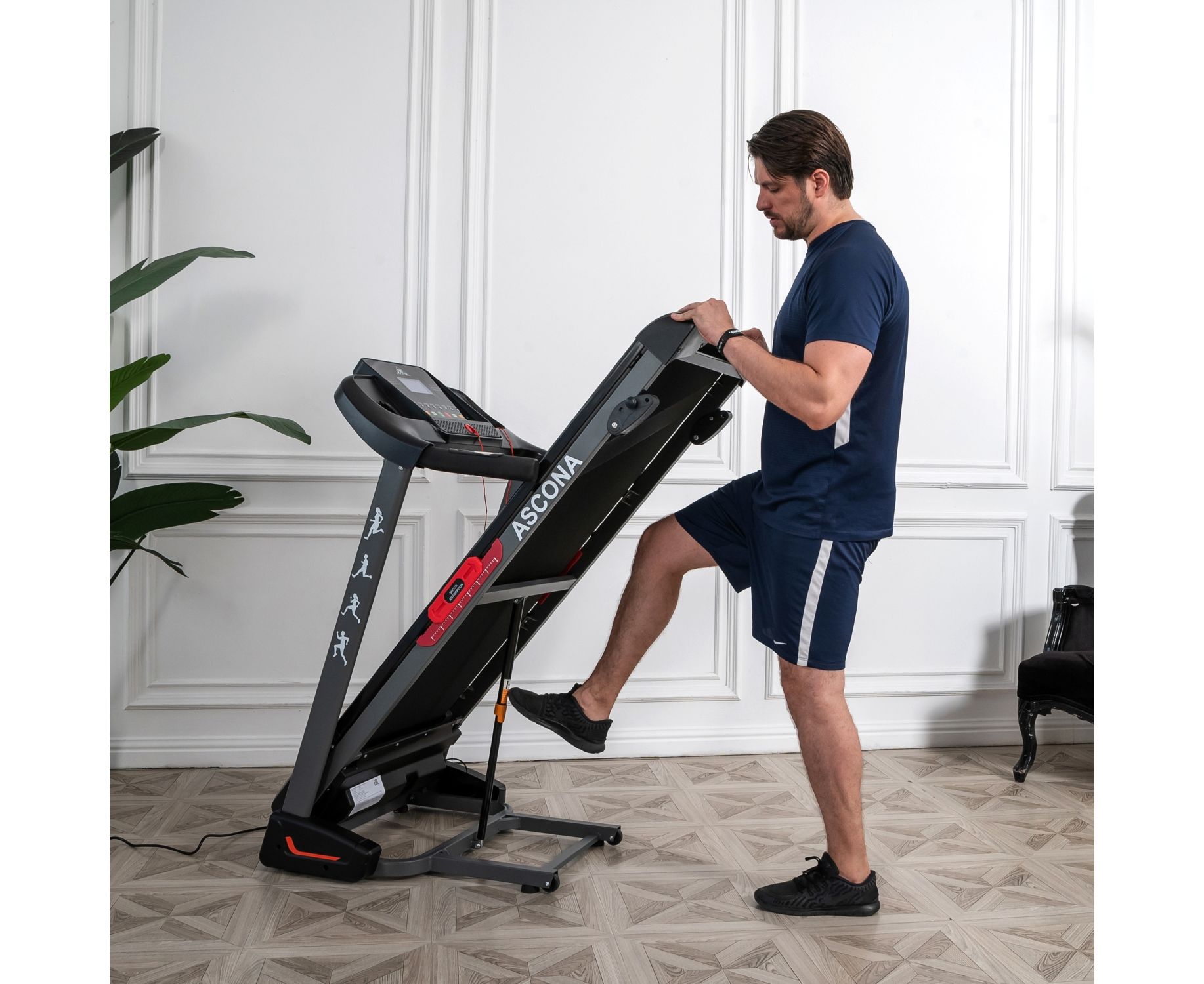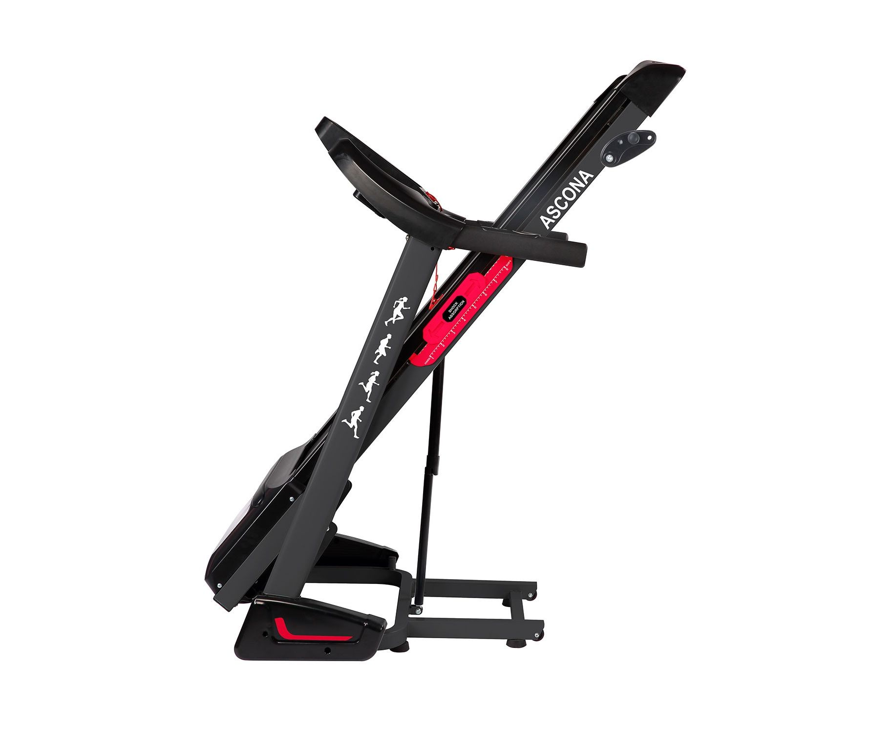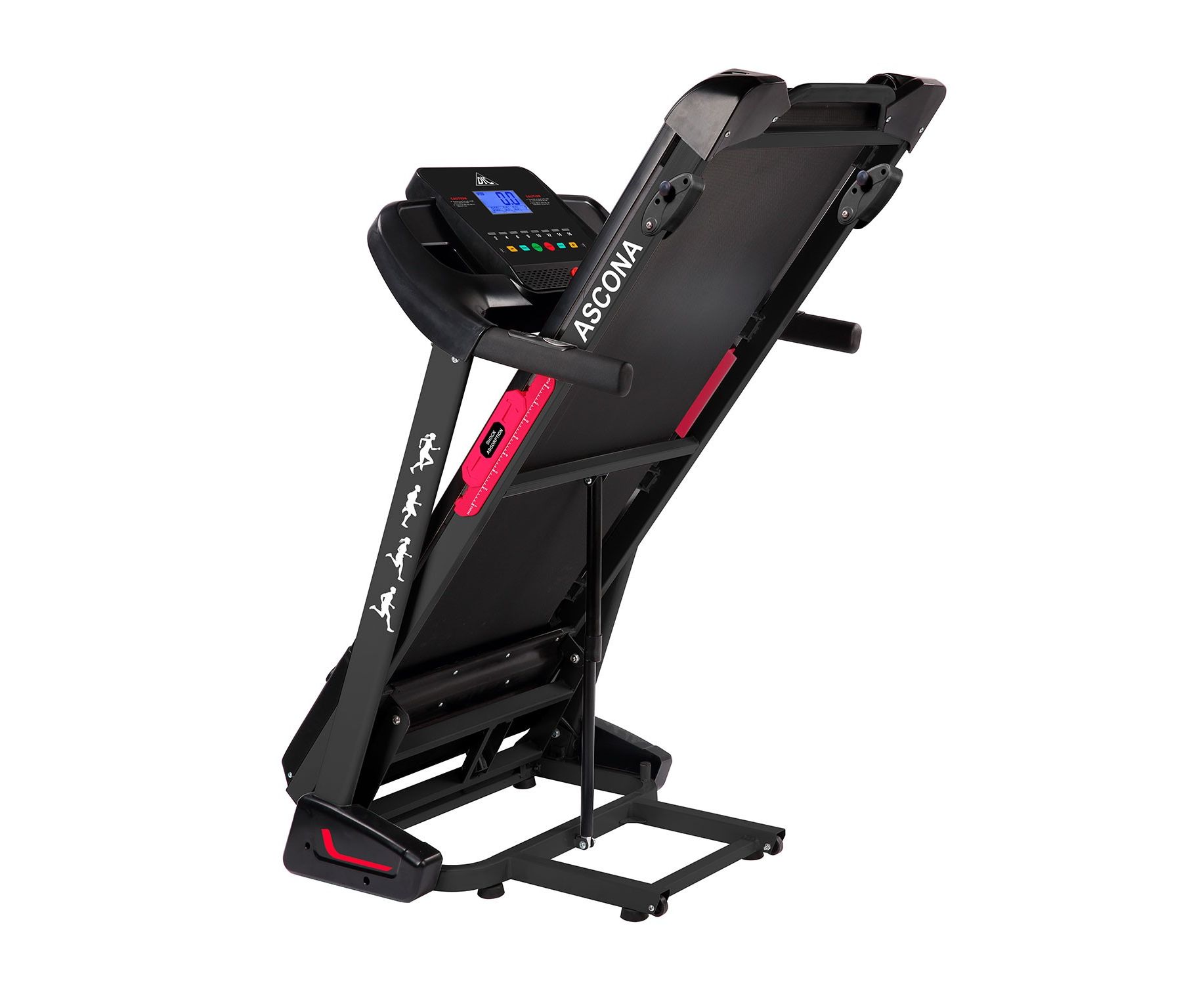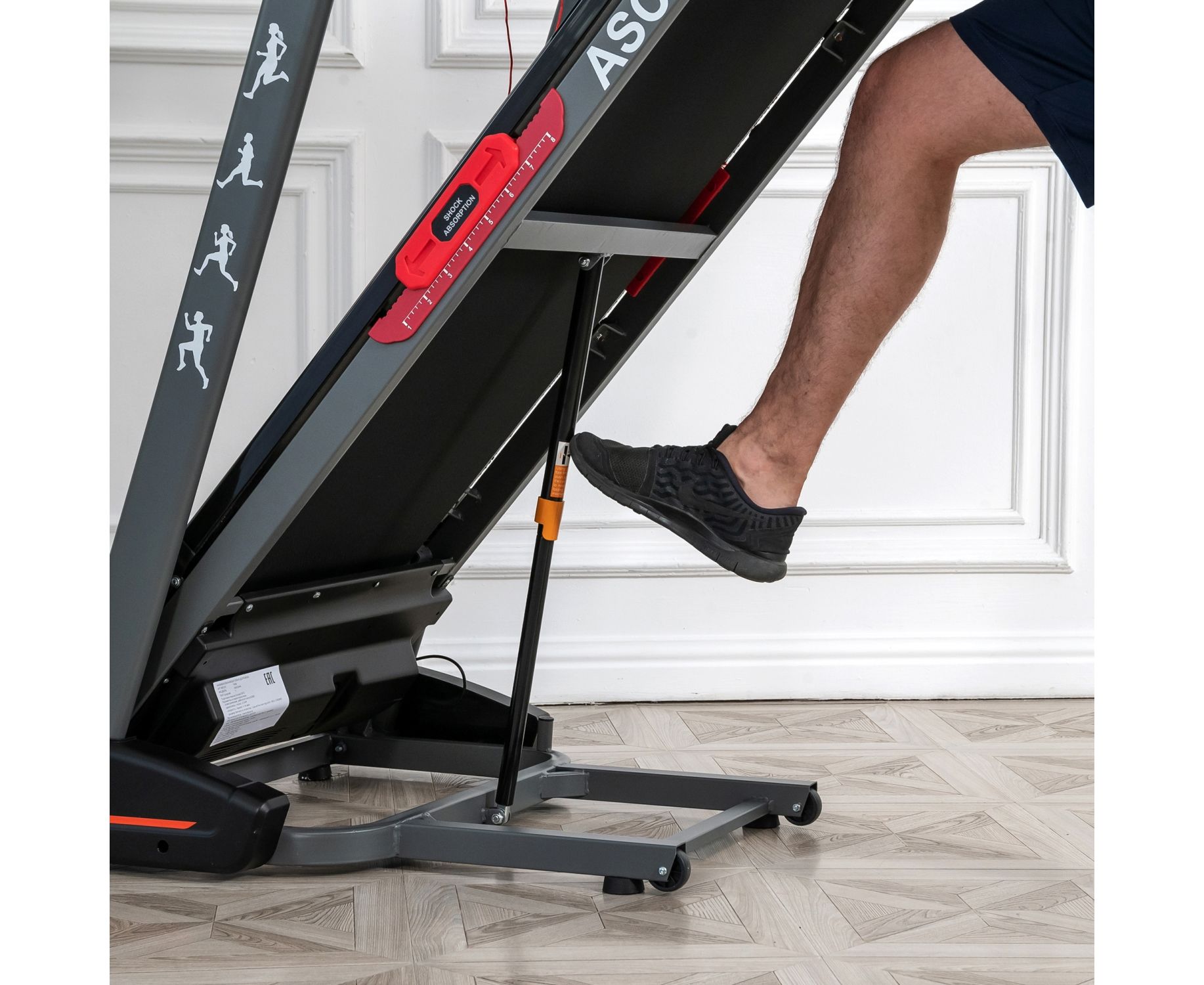 Дорожка имеет складную конструкцию для экономии жизненного пространства с помощью гидроцилиндра. И встроенные колеса для перемещения дорожки после тренировки.