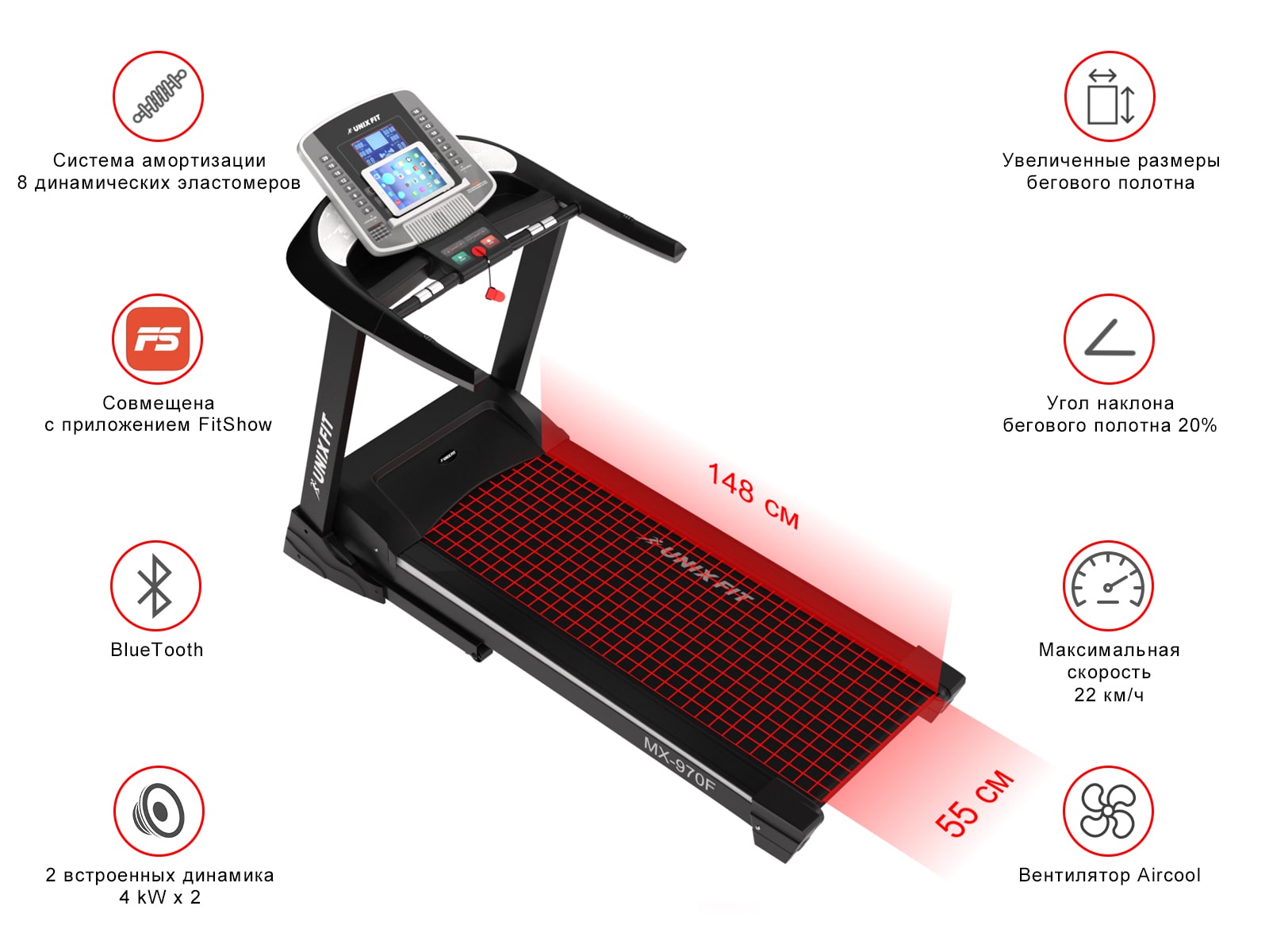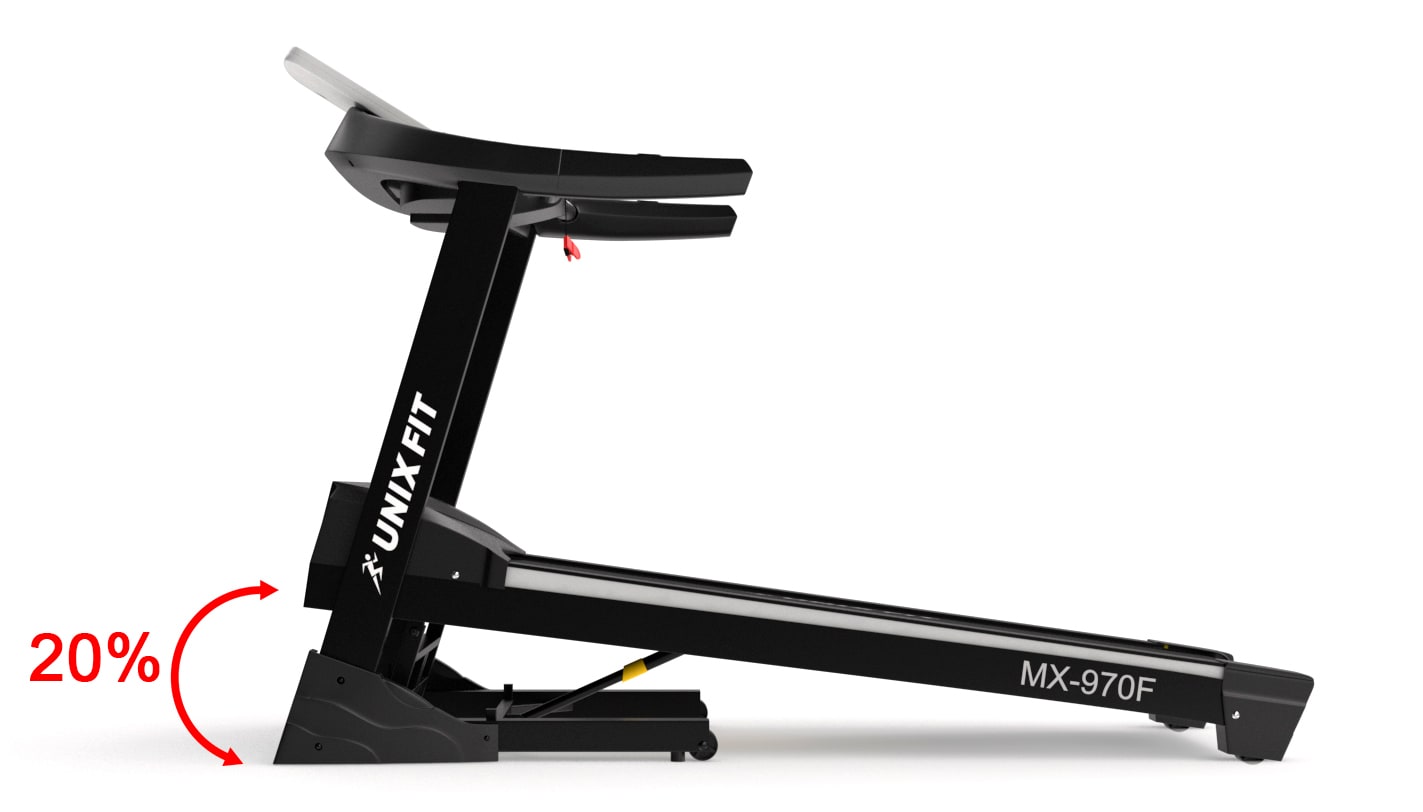 Максимальная скорость беговой дорожки UNIX Fit MX-970F составляет 22 км/ч, максимальный угол наклона бегового полотна 20 %. Беговая дорожка оборудована системой вентиляции Aircool. Вентилятор, встроенный в панель управления, создает необходимые для комфортной тренировки колебания воздуха.