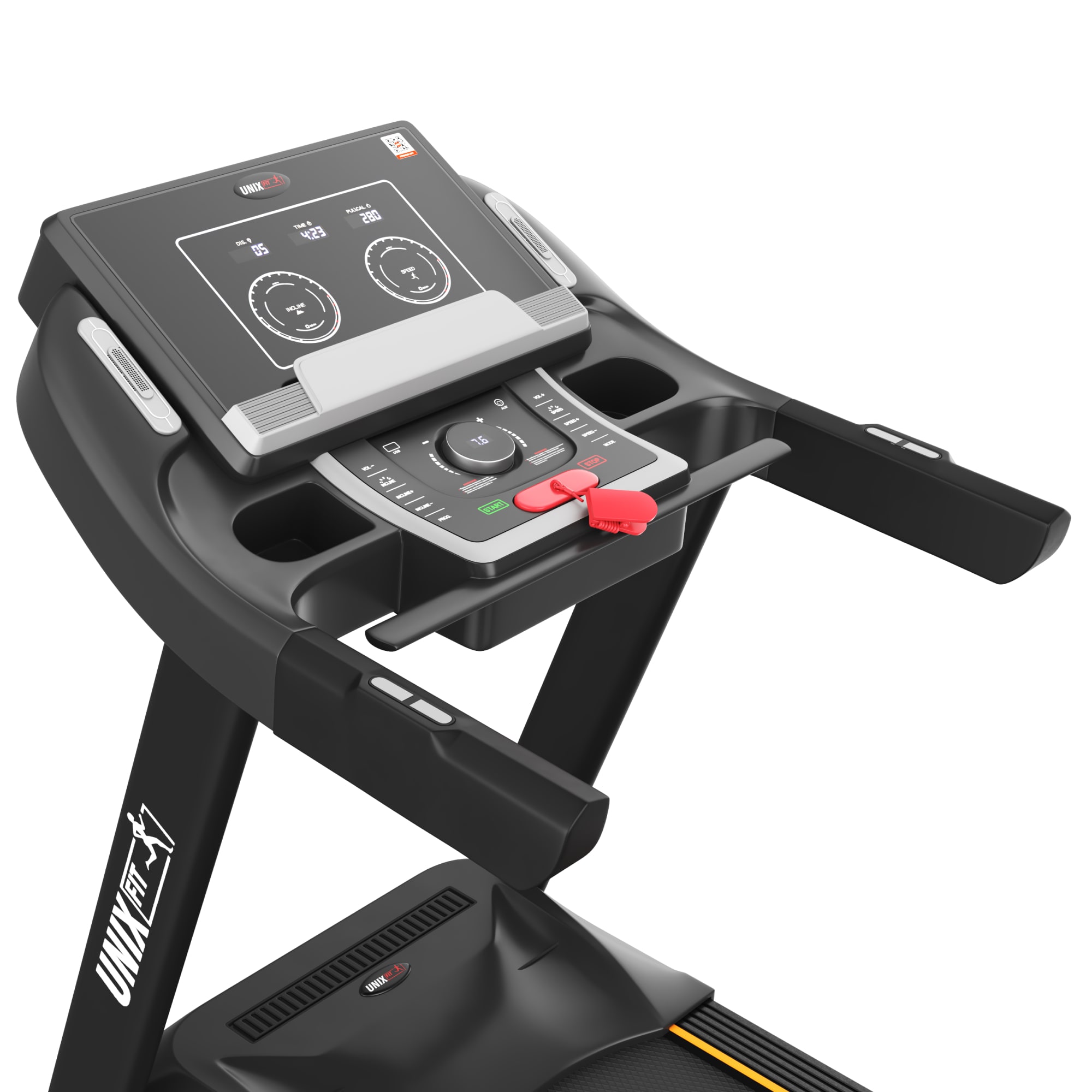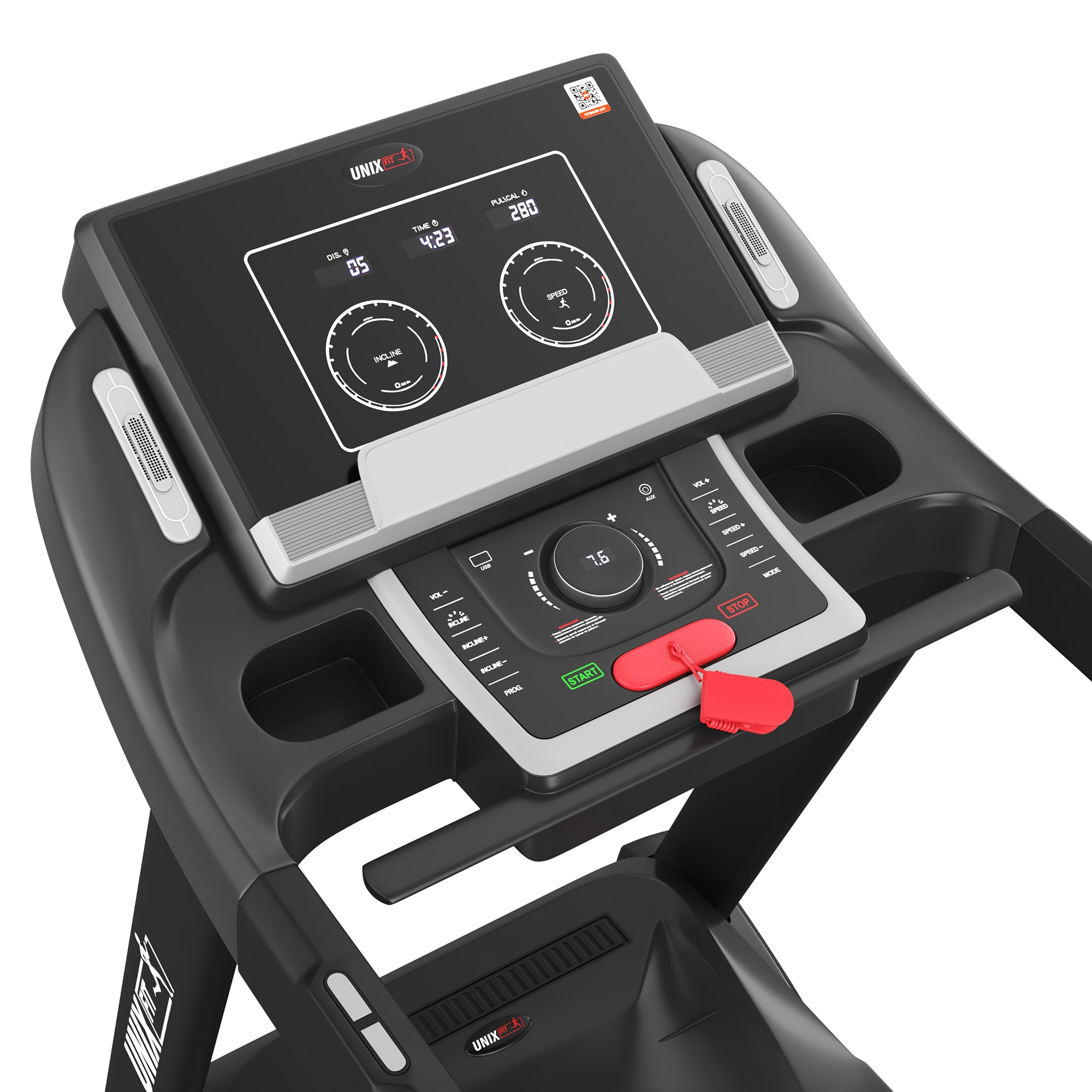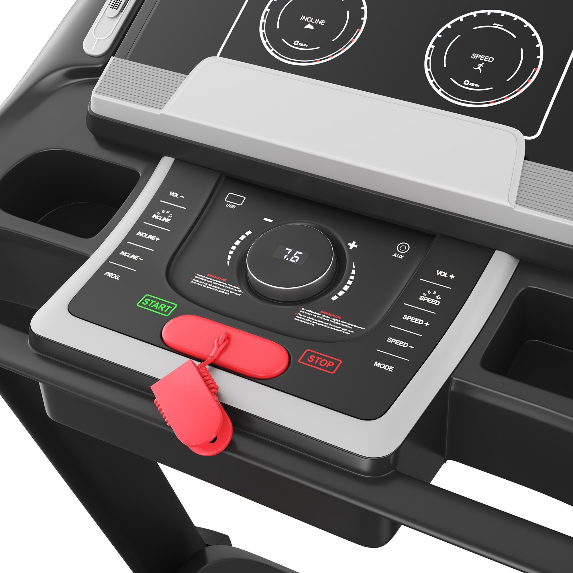 Мультимедиа на дорожке представлена в виде двух встроенных динамиков и возможностью подключить смартфон, планшет или MP3-плеер. Два удобных кармана на консоли для размещения личных вещей, гаджетов или бутылки с водой.
