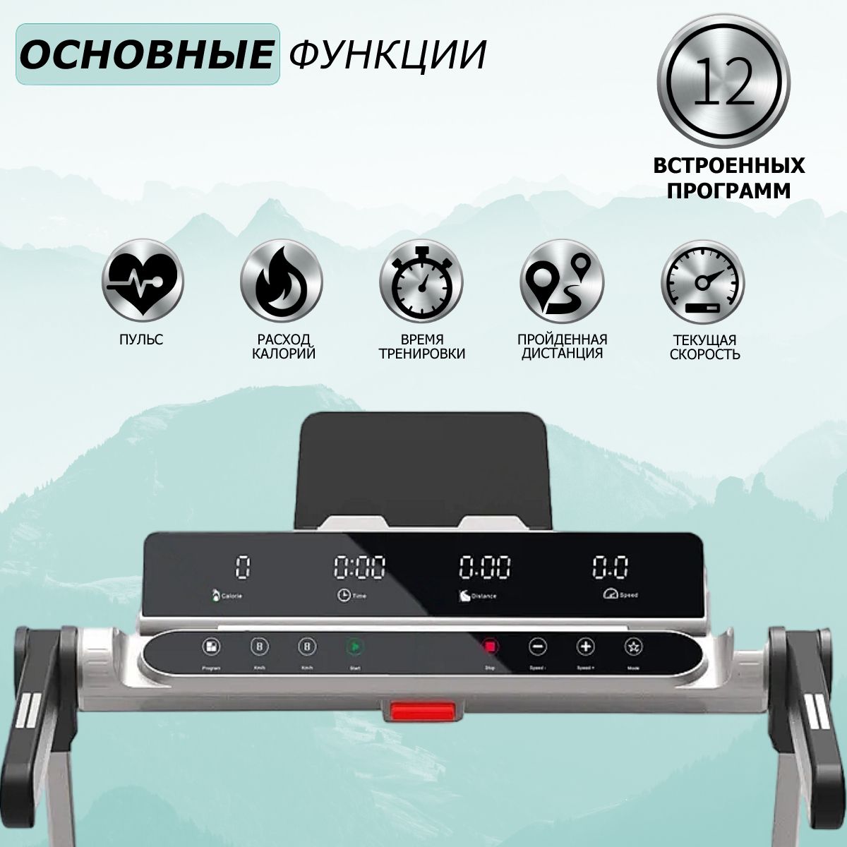 Функции компьютера: Дистанция, Расход калорий, Контроль пульса, Время, Скорость.
