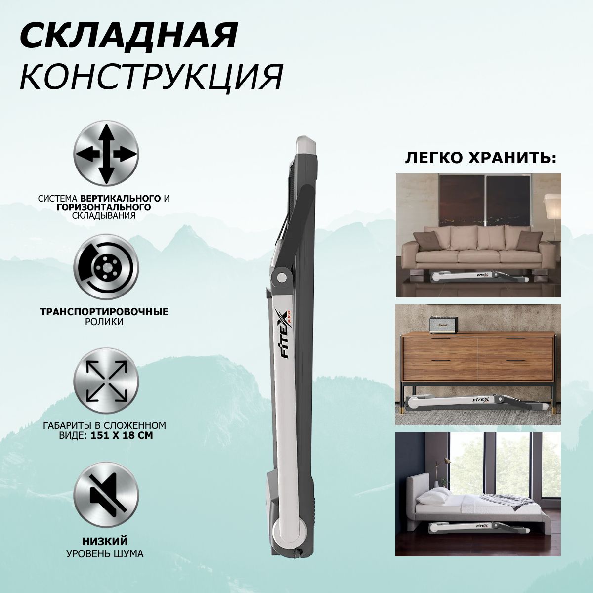 Электрическая беговая дорожка LAIMA разработана для домашнего использования с транспортировочными роликами для удобства передвижения. Поставляется в коробки в собранном виде. Также она оснащена механизмом горизонтального складывания, что обеспечивает комфортное хранение дорожки под краватью.