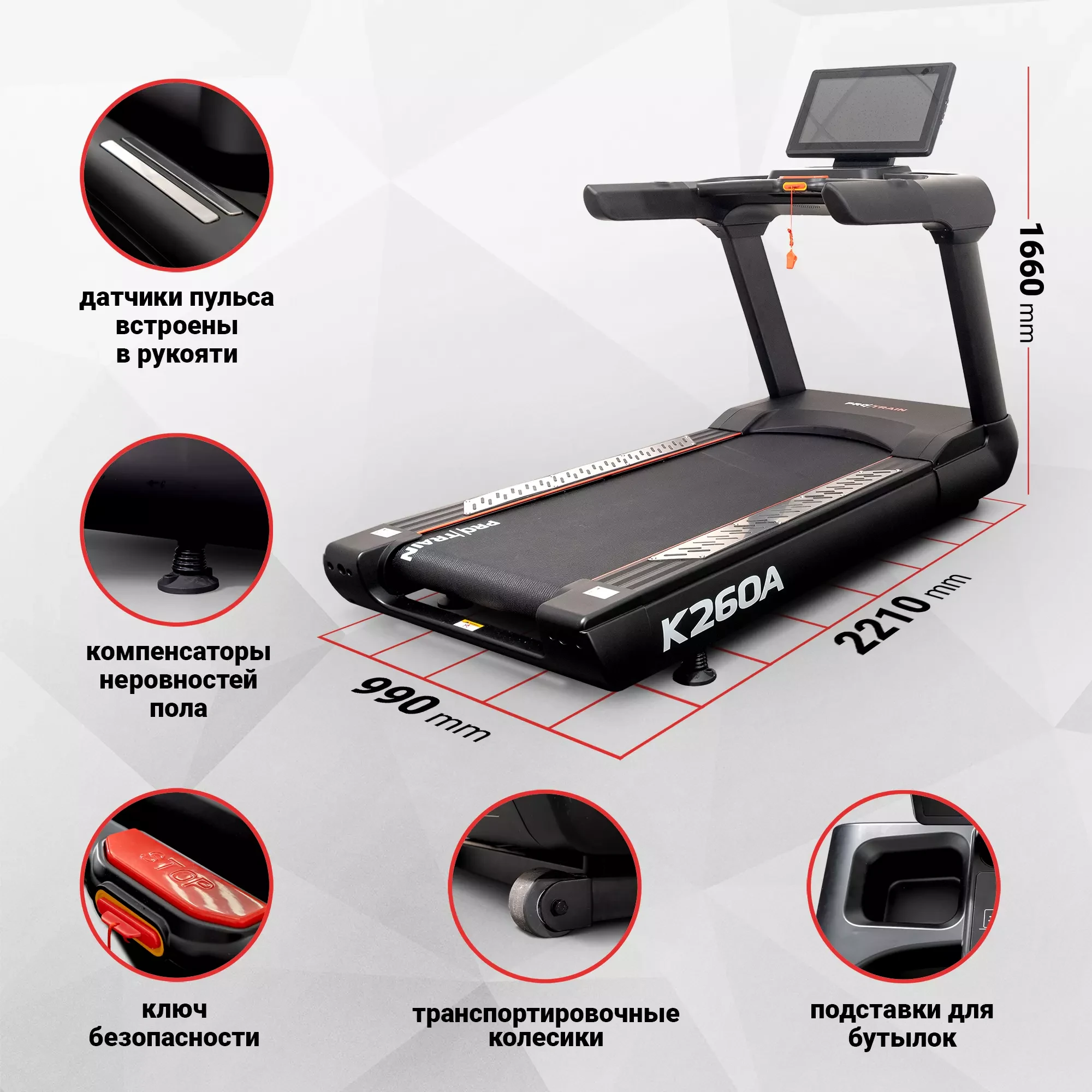 Protrain K260A — профессиональная беговая дорожка. Мощный двигатель, устойчивая конструкция и долгий срок эксплуатации делают эту модель прекрасным вариантом для тренировок в залах с большой проходимостью.