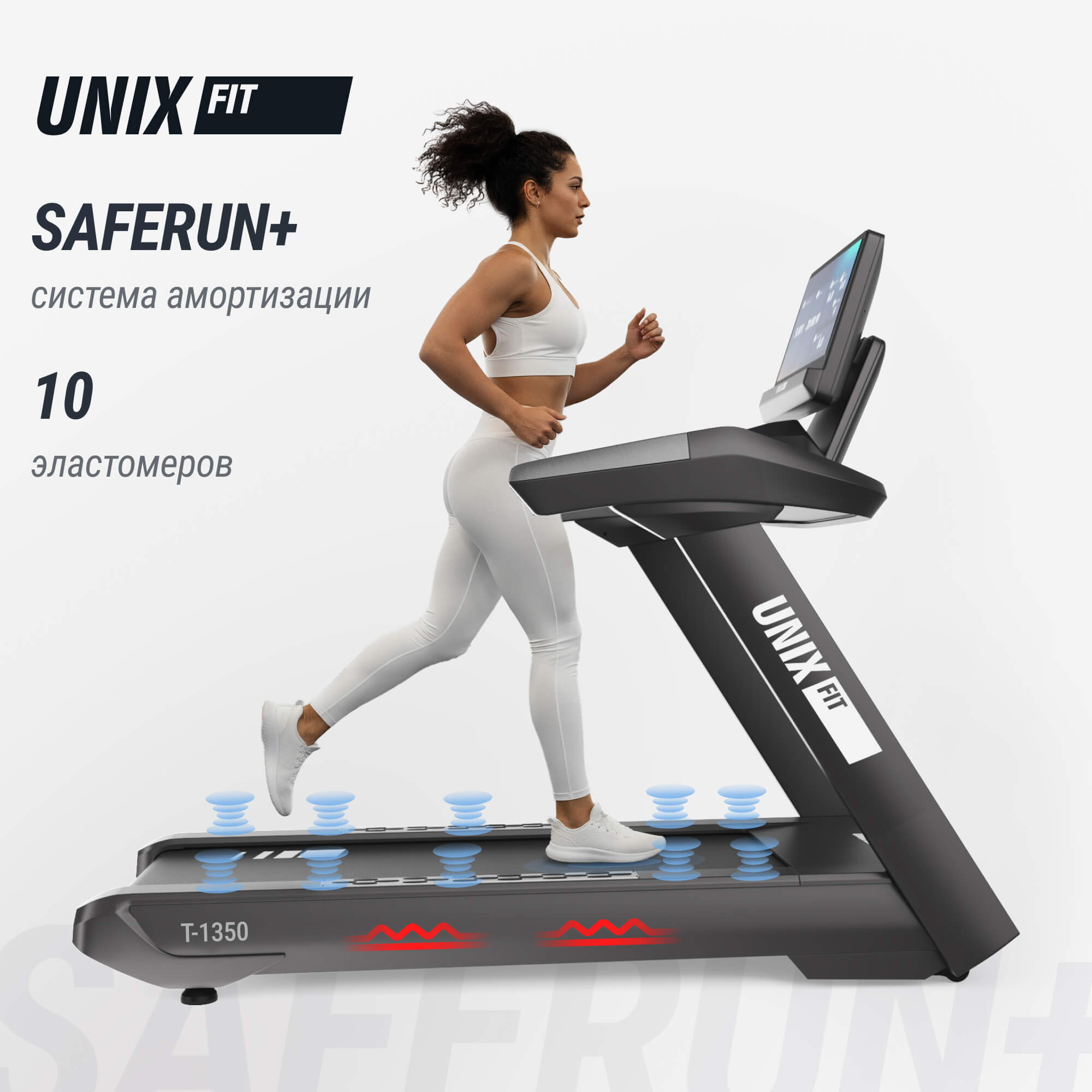 - Амортизация. Беговое полотно оборудовано современной ортопедической системой амортизации SAFERUN+. Ребристая поверхность бегового полотна и 10 встроенных эластомеров улучшают сцепление с кроссовками и делает тренировку более безопасной, если вы используете функцию наклона бегового полотна.