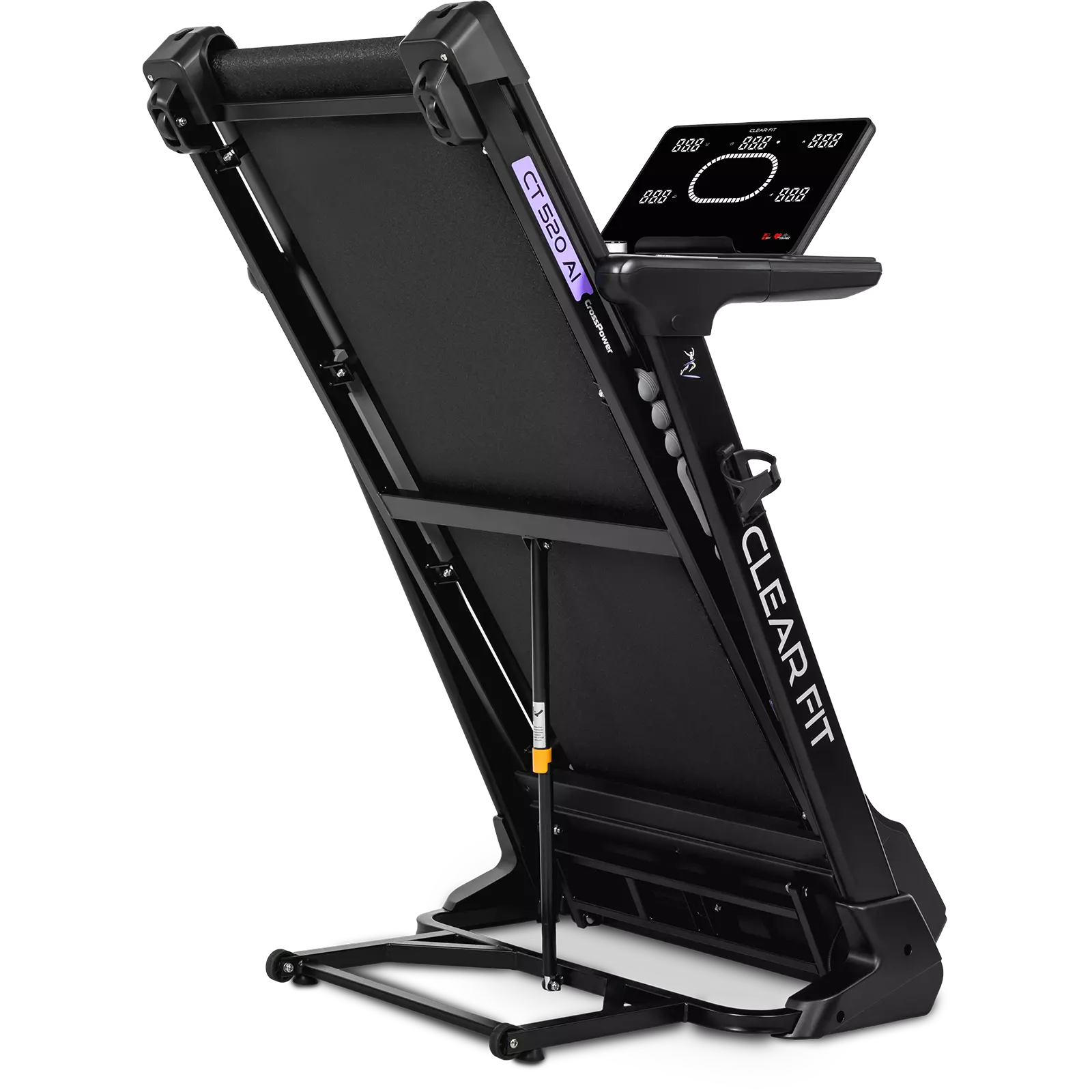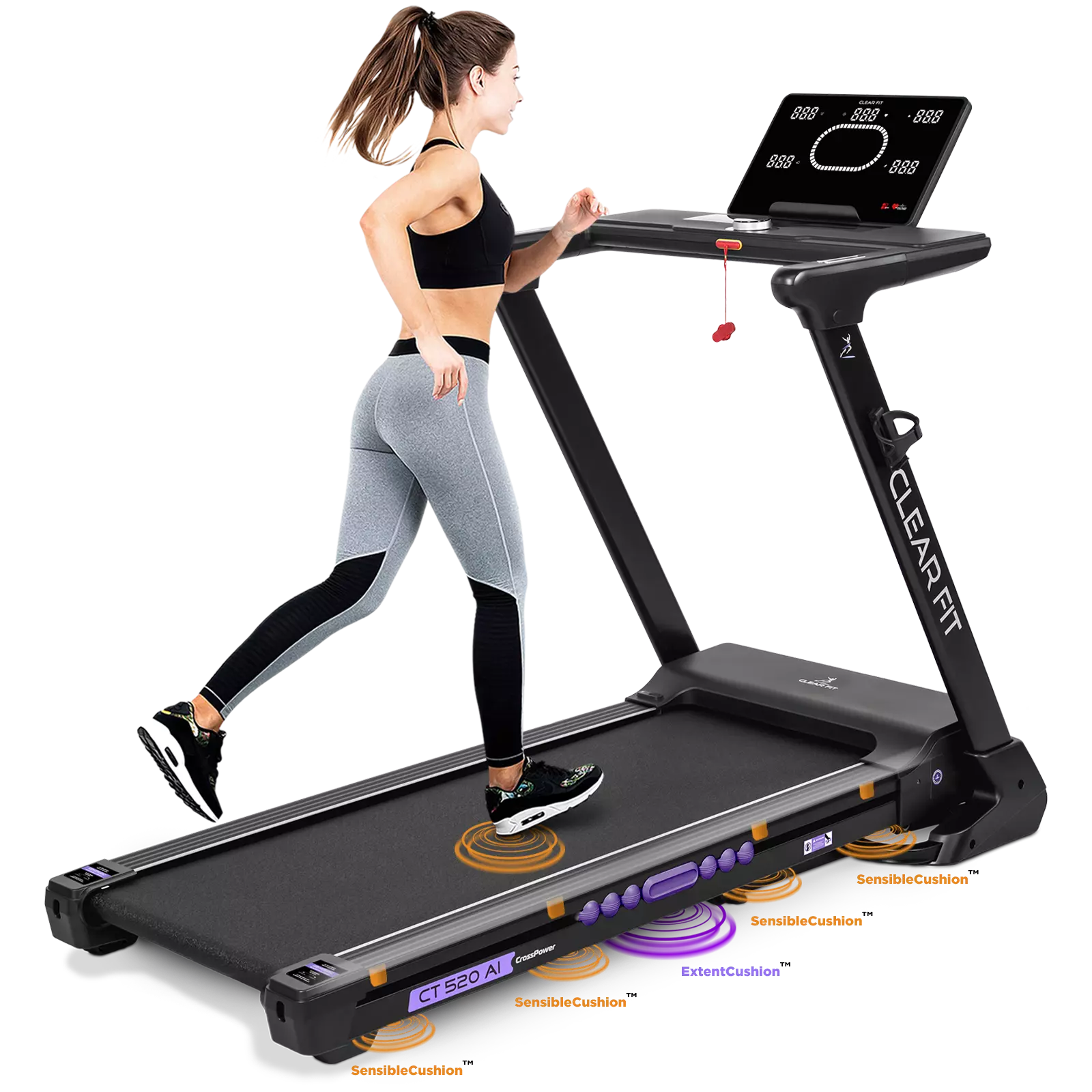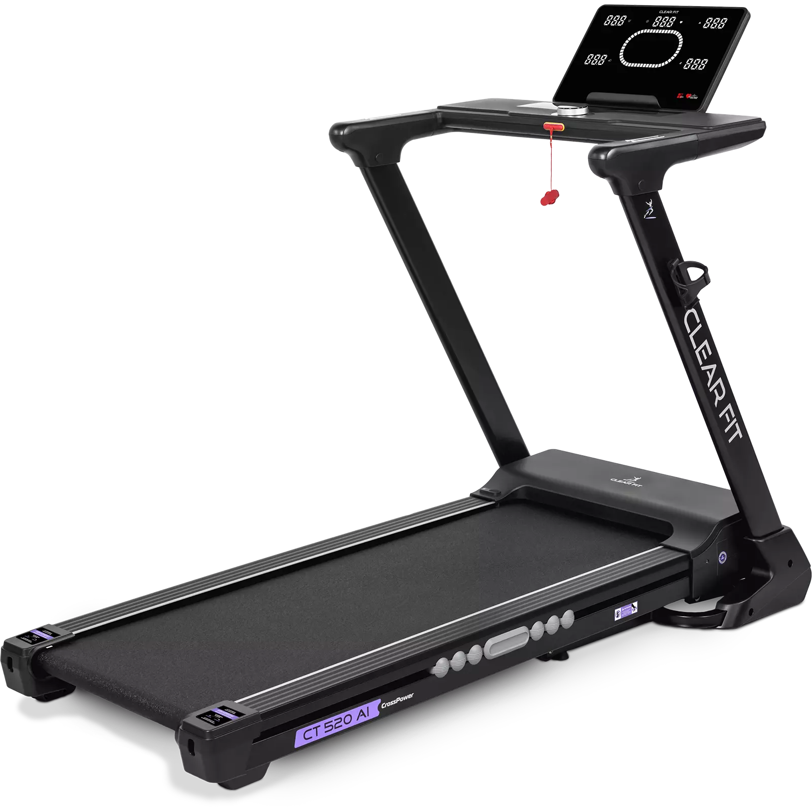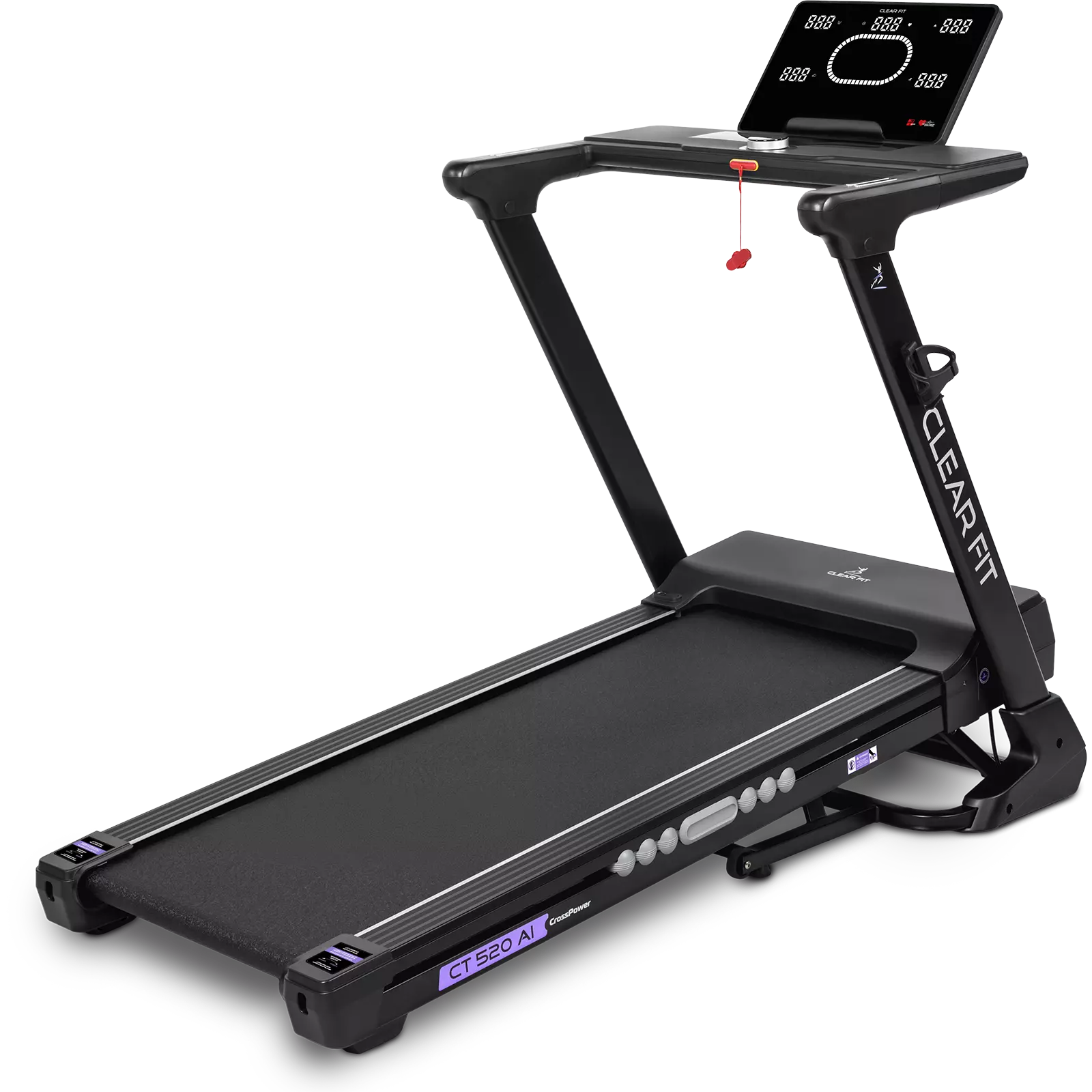 Беговая дорожка для дома Clear Fit серия CrossPower модель CT 520 AI лучший выбор для домашних тренировок бегом и ходьбой: просторное полотно 520 х 1400 мм, электрическое изменение угла наклона 15 уровней, мощный двигатель и современная консоль управления: вариатор шайба с дисплеем, автоматическая смазка полотна, Bluetooth модуль, HRC, расширенный пакет программ, подстаканник и подставка для гаджетов. Надежный, бесшумный двигатель развивает скорость от 1 км/ч до 18 км/ч, плавное изменение и стабильное движение на всех оборотах. Прочная дека и мощная конструкция рассчитаны для пользователей до 150 кг. Качественная зонированная амортизация: 8 эластомеров по периметру SensibleCushion™ и 2 амортизатора ExtentCushion™ в активной зоне, оптимальная, для ходьбы и бега в любом возрасте, защита от ударной нагрузки на суставы и позвоночник.