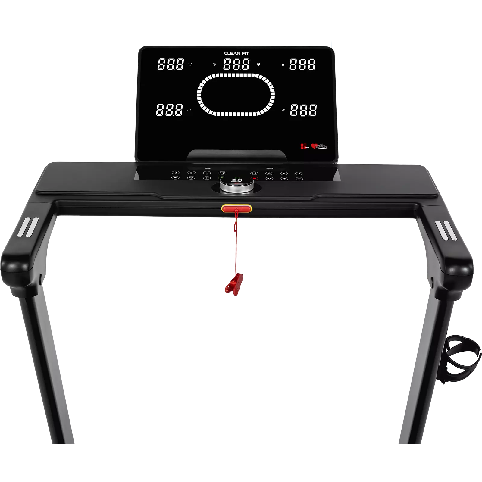 Консоль отличается простой инновационной системой управления, вариатор шайба позволяет легко регулировать настройки во время тренировки, большие удобные клавиши эргономично расположены в зоне доступа, 2 рабочих дисплея, большой современный экран с качественным отображением крупными символами и нижний экран вариатора управления. Большой легкочитаемый дисплей 6 LED отображает основные параметры тренировки: программа, время тренировки, скорость, угол наклона, дистанция, калории, пульс, оценка состояния организма, основные параметры дублируются на втором экране. Лаконичное управление облегчает настройку программ, контроль и проведение тренировок. Оптимальный пакет программ повышает эффективность тренировок, помогает сохранить мотивацию и интерес к занятиям. На поручнях расположены сенсорные датчики пульса и клавиши быстрого доступа для изменения скорости и угла наклона, на нижней панели клавиши «быстрого выбора», вариатор управления для регулировки скорости, старта и паузы. Вы легко и быстро можете регулировать настройки программы, наклон и скорость во время движения. Программный пакет из 26 тренировок, включает 3 пользовательские, 3 пульсозависимые, для похудения, целевые, для выносливости и восстановления сердечно-сосудистой системы.
