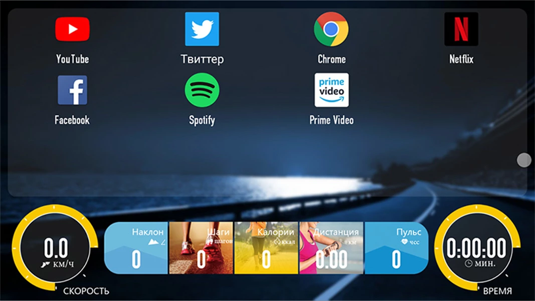 Высокотехнологичная консоль с большим цветным TFT-дисплеем 10.1”. Все параметры, схемы и графики тренировки отображаются в удобном формате, для восприятия «в движении». Программный пакет включает активный виртуальный ландшафт и режимы соревнования, в общей сложности более 40 программ: пульсозависимые, персональные, интервальные, на выносливость, BodyFat и пр. TFT консоль подключается к сети Internet, доступны к просмотру: YоuТubе, Spotify, Тwittеr**, Fасеbоok*, поиск в браузере, оснащена USB reading port для воспроизведения видео и аудио файлов.