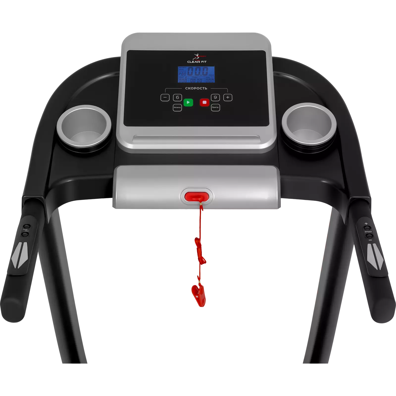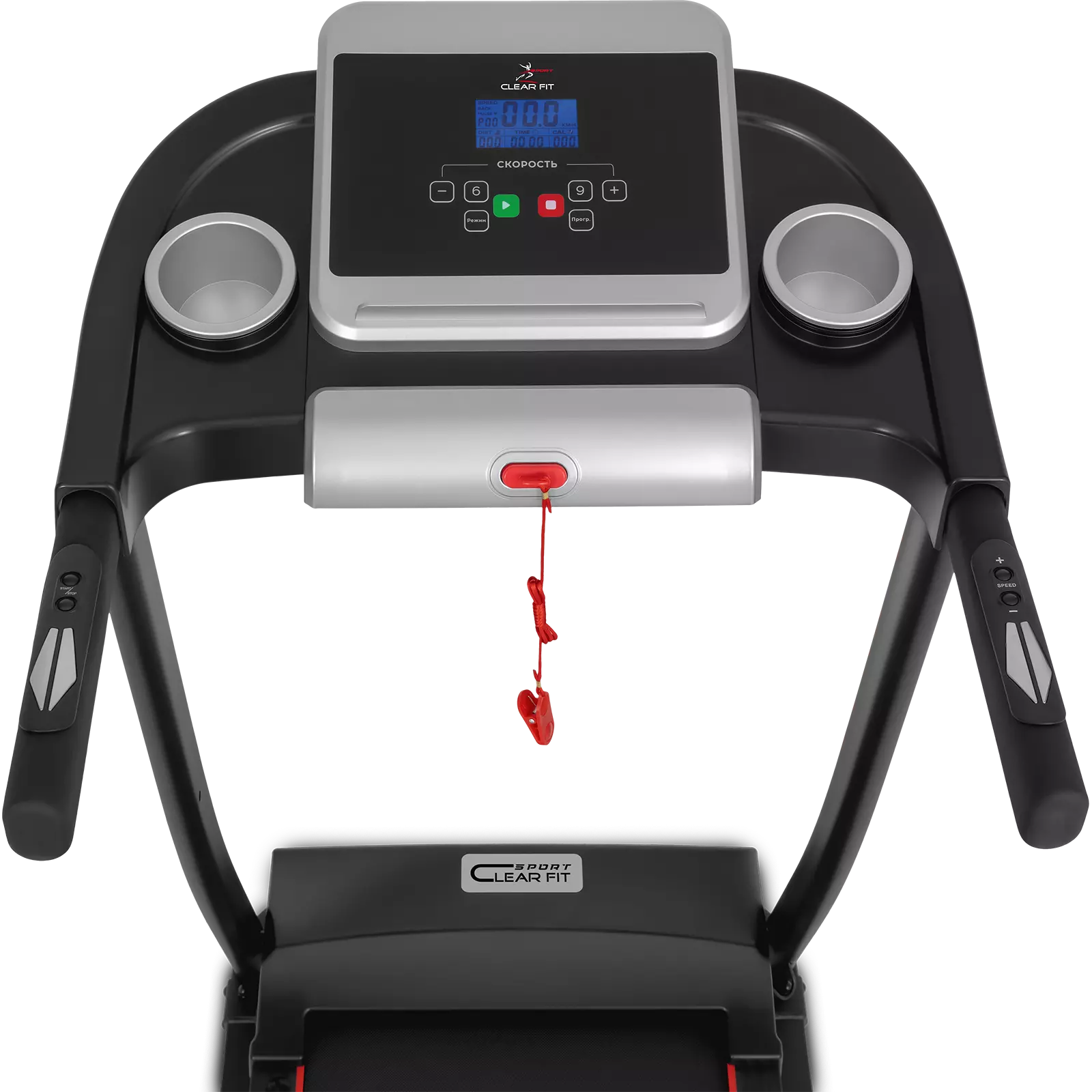 Панель управления полностью русифицирована, LСD дисплей 3” с синей подсветкой отображает все ключевые параметры тренировки: время, скорость, дистанция, калории и пульс. Консоль отличается простой, удобной системой навигации на русском языке, современным и лаконичным дизайном. Оптимальный пакет программ повышает эффективность тренировок, помогает сохранить мотивацию и интерес к занятиям: 17 разноплановых тренировок, аэробные, целевые программы и тест программу BodyFat. На поручнях расположены датчики пульса и клавиши быстрого доступа для регулировки скорости.