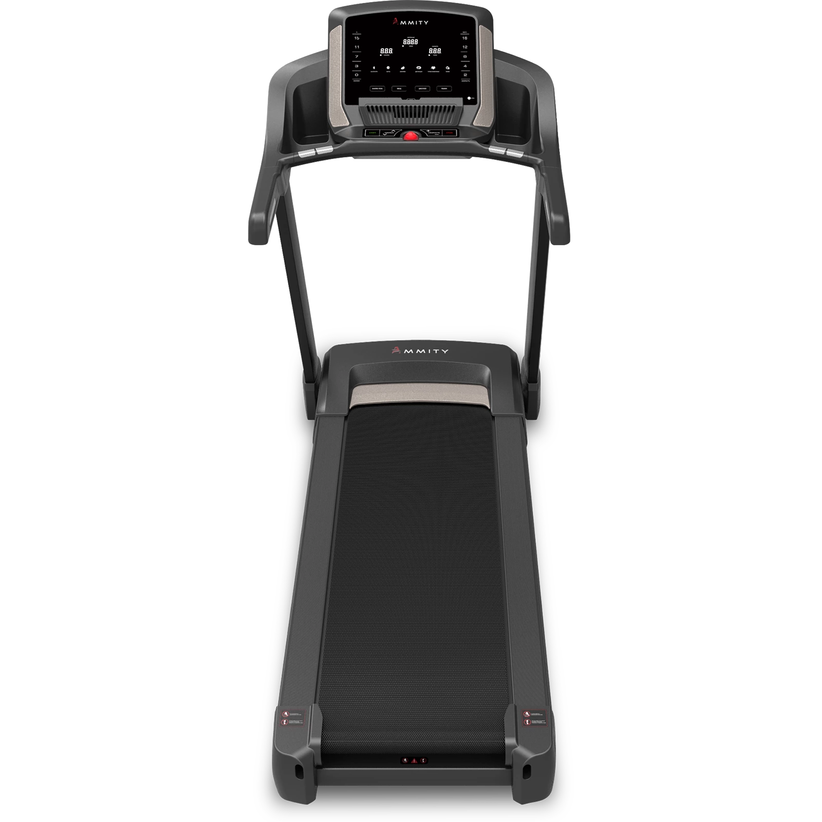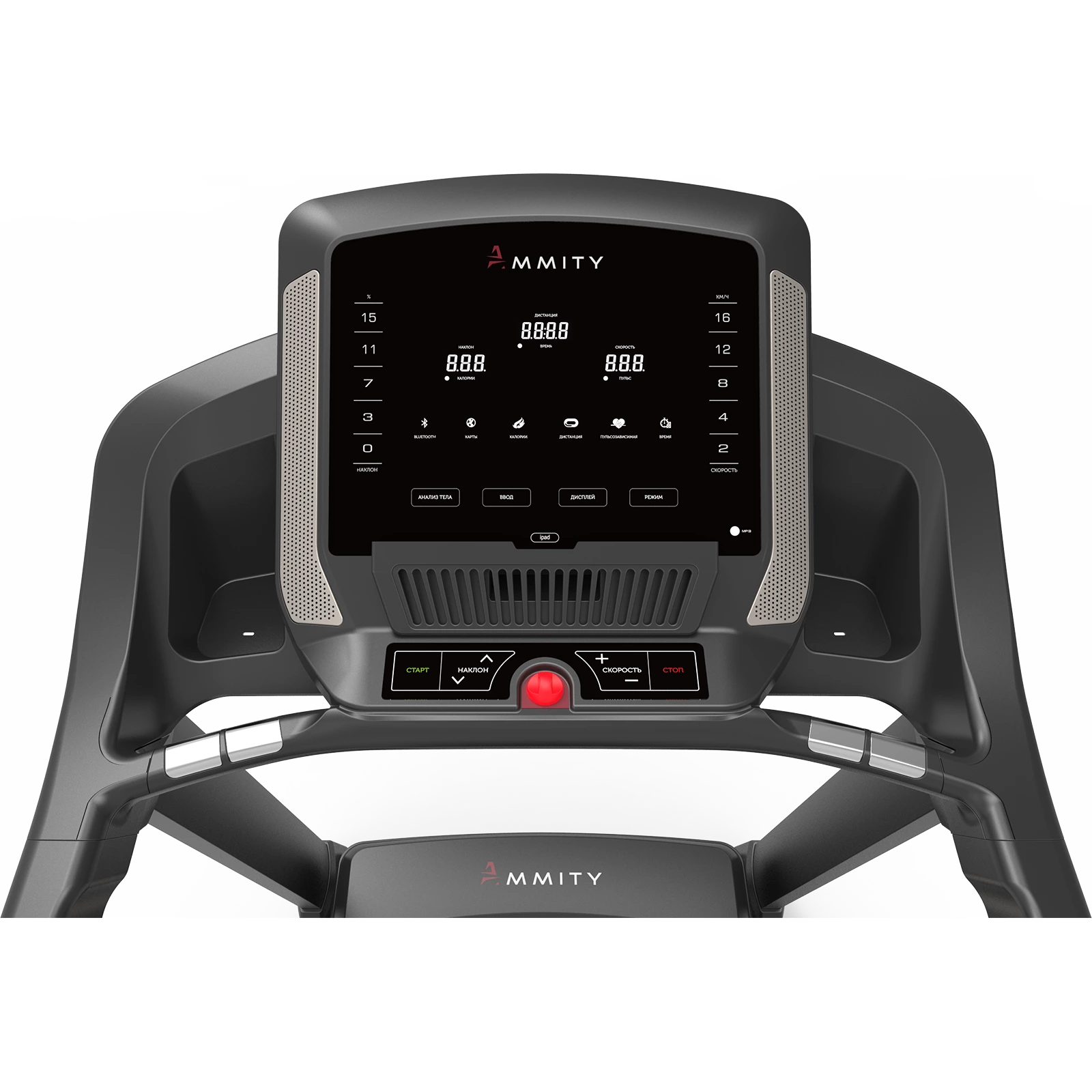 Консоль управления: функциональная, русифицированная панель, удобный экран состоит из 3-х больших LED окон, отображают: скорость, угол наклона, калории, время, дистанция, пульс. Помимо штатного программного обеспечения, консоль позволяет использовать спортивные APP-приложения iOS/ANDROID посредством Bluetooth-соединения. Предустановленный пакет программ состоит из 34 тренировок: интервальные, пользовательский, пульсозависимые и пр.. Встроенная система мультимедии поддерживает формат MP3, консоль оборудована 2 динамиками.