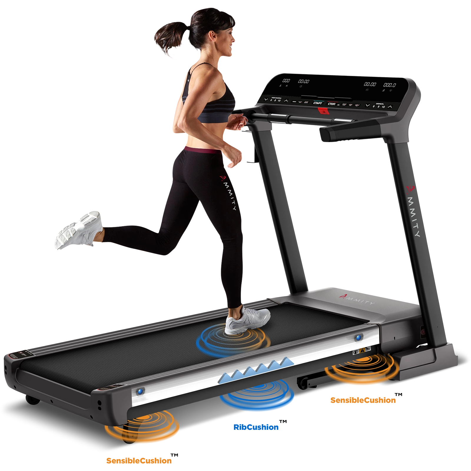 Амортизация: ходьба и бег — наиболее естественный и приятный способ достижения отличной физической формы, но интенсивные тренировки не только приводят к быстрому результату, но и дают лишнюю нагрузку на суставы. Двойная система амортизации состоит из классической, проверенной временем системы SensibleCushion™, смягчающей бег, и дополнительной амортизации центральной части деки RibCushion™, что позволяет максимально эффективно и безопасно использовать тренажер при любой скорости тренировки, вне зависимости от возраста спортсмена.