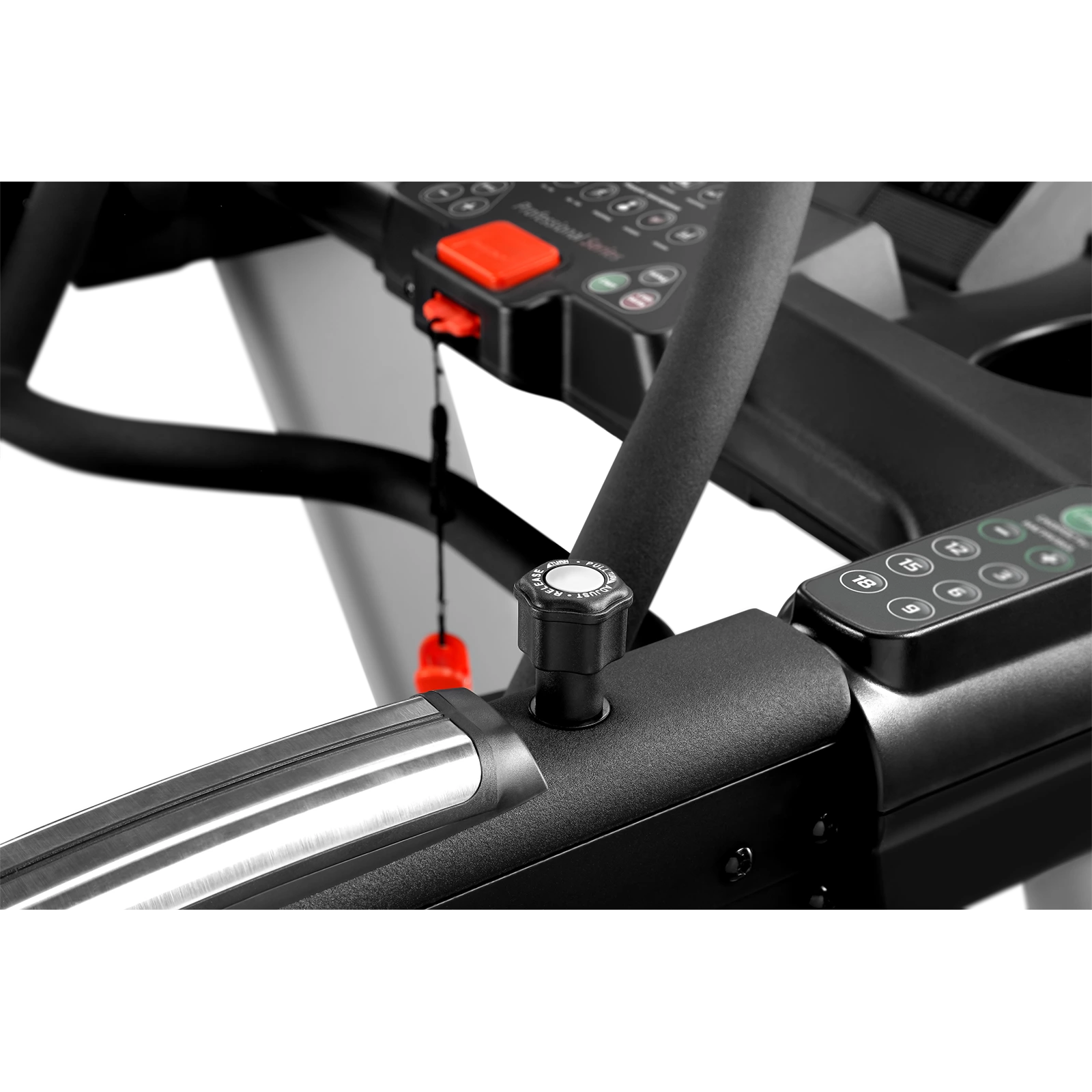 Пульт управления дорожкой состоит из двух панелей: панель управления беговой дорожкой и панель силового сопротивления. Пакет программ включает 12 силовых программ и 21 кардиотренировку — интервальные разной сложности, целевые программы для повышения выносливости, скорости и улучшения физической формы, пользовательские и т.д. Легкочитаемый LED дисплей состоит из 5 окон, отображает тип занятия (силовое или кардио), параметры и данные о тренировке: текущие скорость, пульс, дистанцию, темп, затраченную энергию в Вт и калориях, уровень нагрузки, рекомендованные верхнюю и нижнюю границы пульса согласно возрасту, выбранную программу, угол наклона.