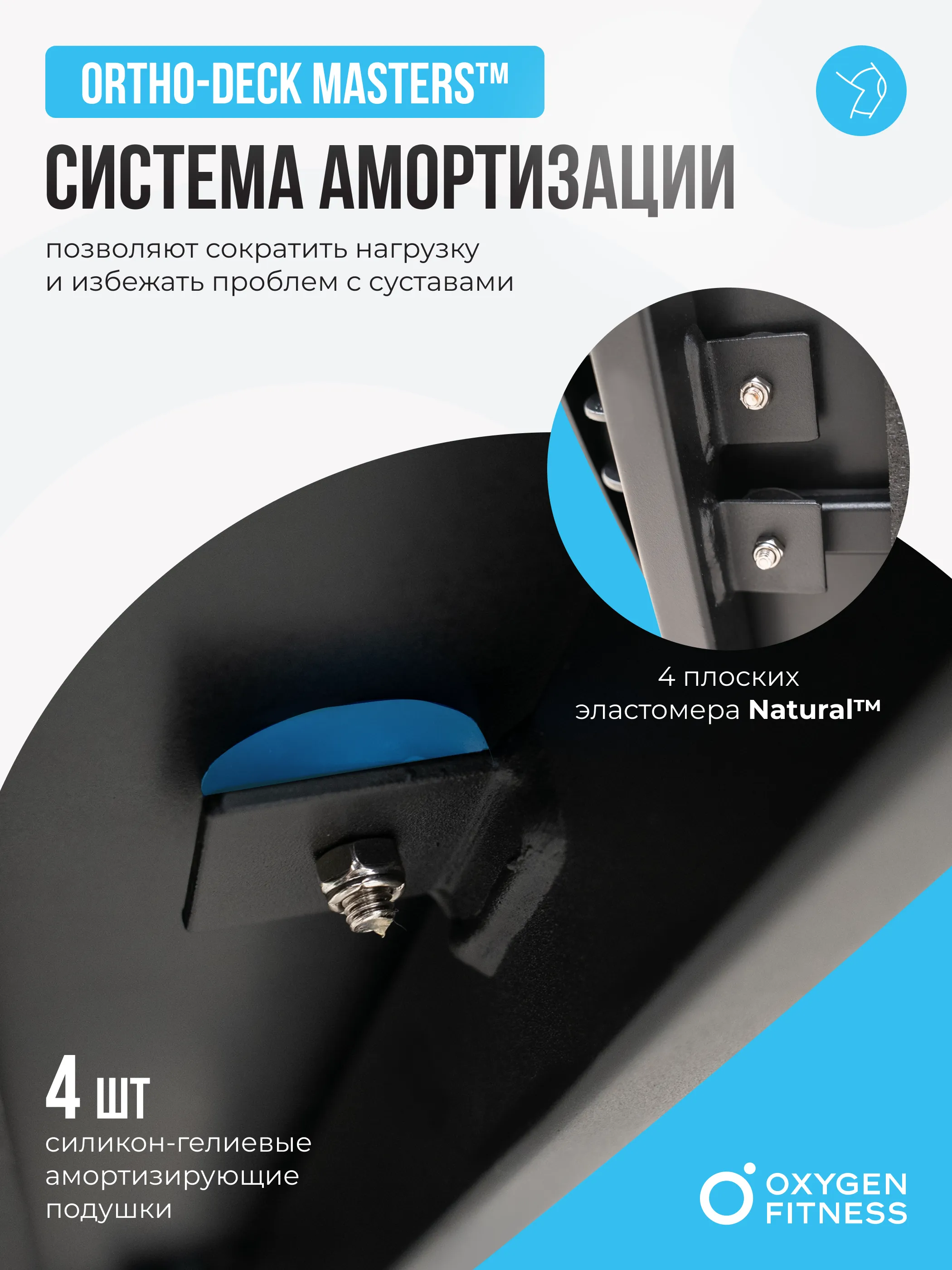 • комфортная амортизация: система амортизации с 4 силикон-гелиевыми подушками и плоскими эластомерами для снижения нагрузки на суставы;
