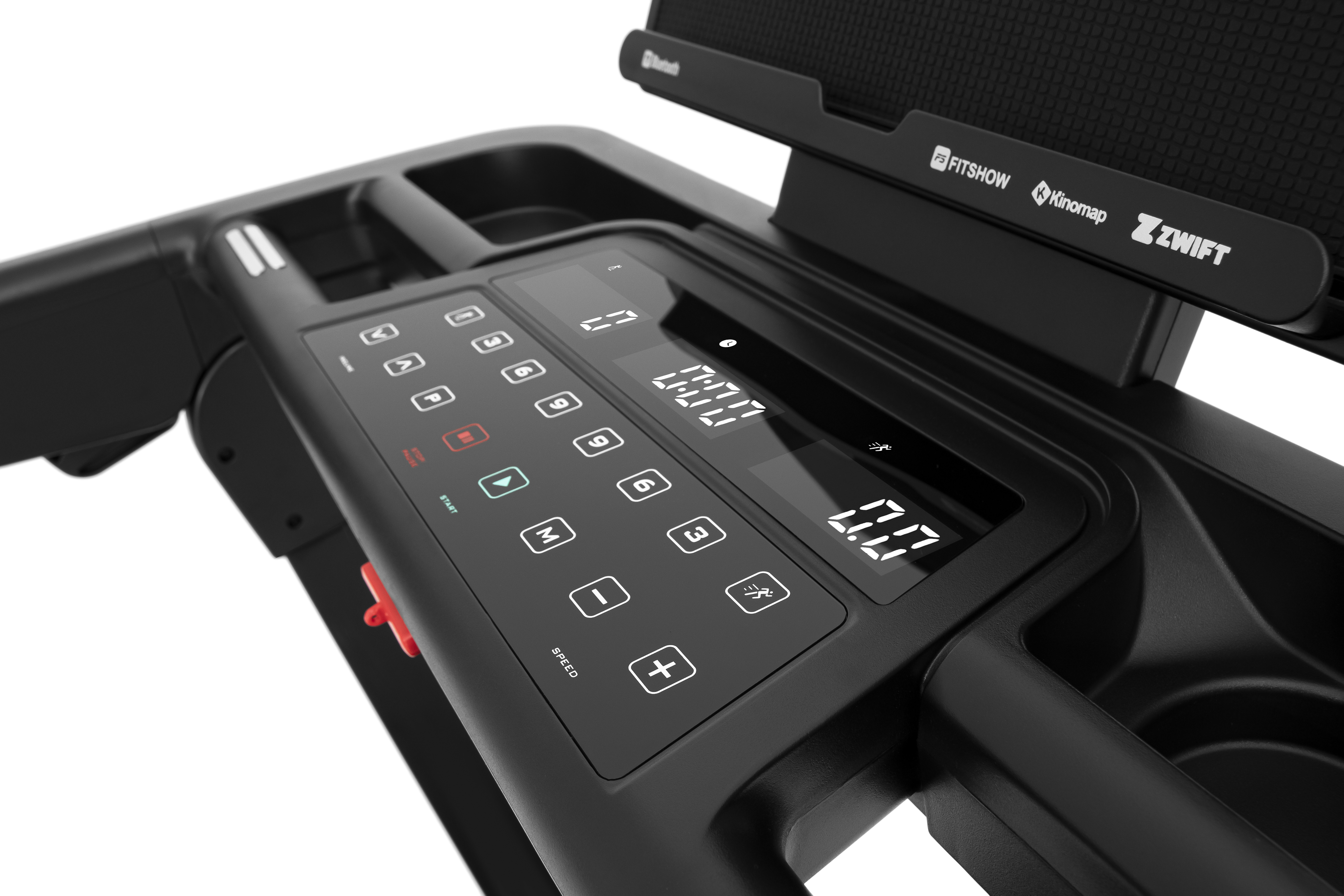 Тренировочный компьютер является еще одним преимуществом тренажера. В отличии от большинства других компактных дорожек, Aura Labs™ Оdyssey обладает полноценной консолью на уровне стационарных дорожек. Большие удобные функциональные клавиши, 3-х экранный LED-дисплей, 2 подставки под бутылку и полки для хранения, а также подставка под планшет с USB зарядкой. Тренировочный компьютер включает в себя 24 предустановленные программы для ходьбы и бега, 3 программы обратного отсчета времени, дистанции и калорий. 3 пользовательские программы позволяют создать собственные тренировочные профили. Пульс можно контролировать с помощью одной из двух пульсозависимых программ – для получения точных значений в консоль встроен беспроводной приемник пульса Bluetooth™ Wireless (для работы требуется ремень-передатчик, приобретается отдельно). Жироанализатор Body Fat покажет уровень жира в организме.