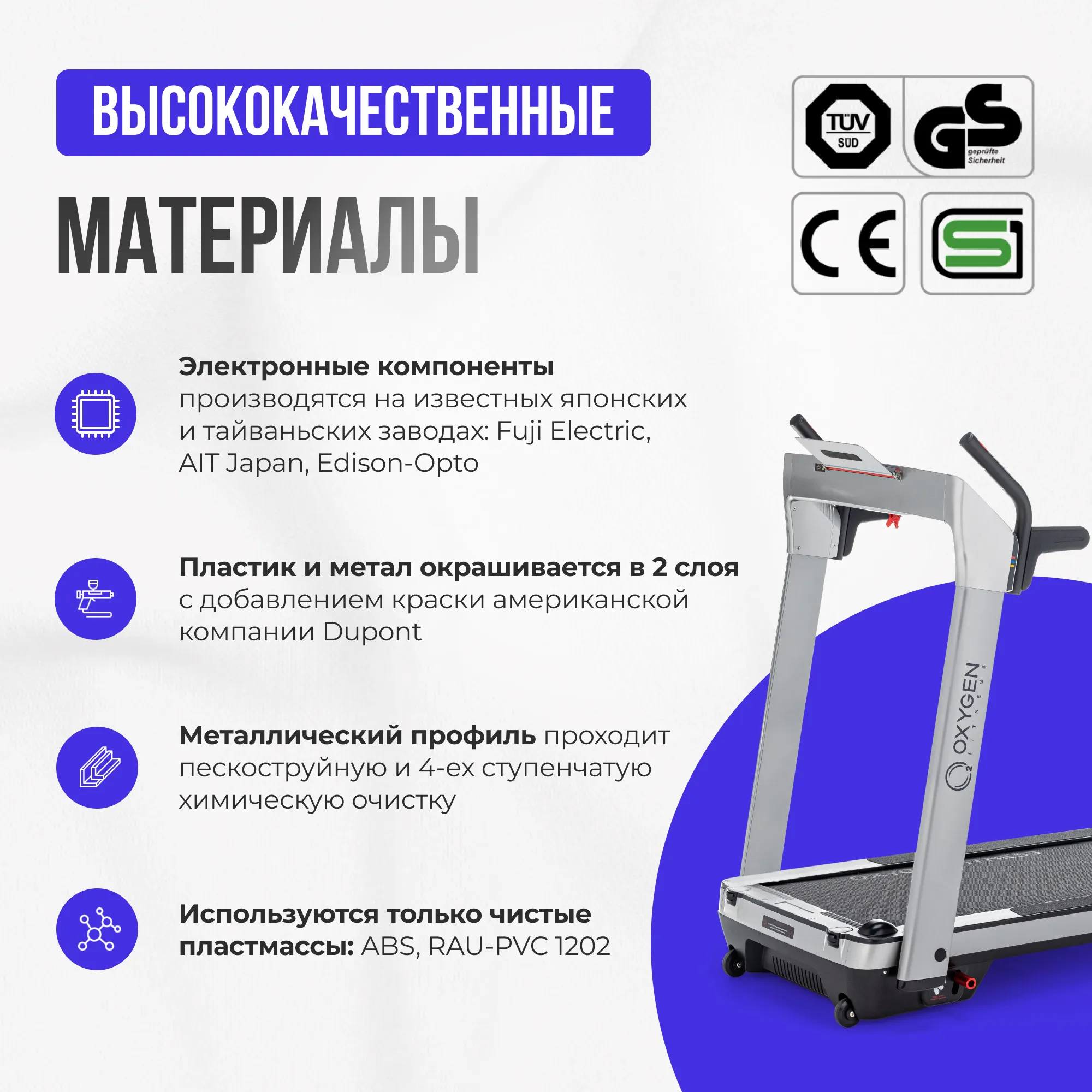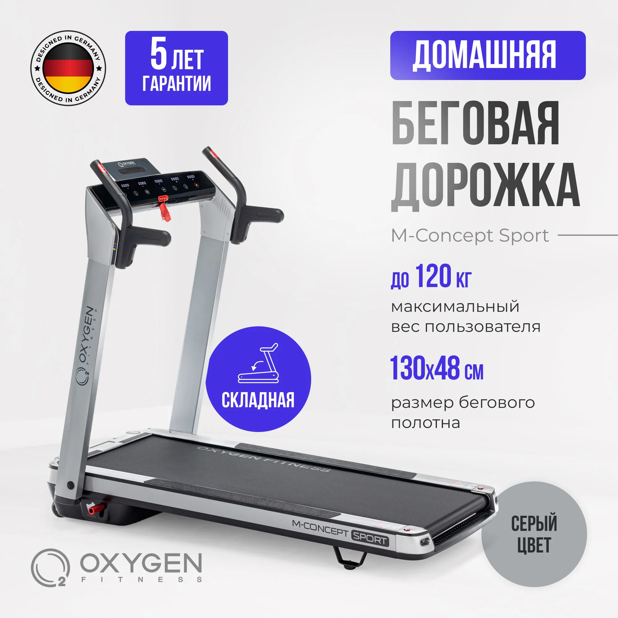 Теперь стоит перейти к главным преимуществам серии M-Concept. Здесь для начала стоит сказать, что практически все ультракомпактные беговые дорожки страдают ограниченным функционалом. Зачастую это вообще чистый маркетинговый продукт, эксплуатирующий желание потребителя заниматься фитнесом в условиях небольшой городской квартиры. Полноценная беговая дорожка по факту "съедает" до 4-ех квадратных метров площади (многие пользователи не складывают дорожку, плюс необходимая зона безопасности вокруг). Соответственно, ради ультракомпактности жертвуется многим - по факту имеем слабые неустойчивые рамы, откровенно маломощные двигатели, скорость до 6 или 8 км./ч., отсутствие амортизации и угла наклона. Некоторые модели не имеют поручней. Ходьба, и тем более бег на таких дорожках достаточно опасен - при небольшой потере равновесия удержаться не за что, и все в итоге может закончиться травмой. В целом, стоит очень внимательно отнестись к покупке ультракомпактной беговой дорожки, объективно оценить плюсы и минусы, понять сможете ли Вы в принципе пользоваться этим изделием. OXYGEN FITNESS™ M-Concept - это принципиально иной подход к компактным беговым дорожкам. Да, возможно, толщина здесь немного больше, чем в ультратонких аналогах. Но это настоящая, полноценная беговая дорожка. На ней можно комфортно и эффективно заниматься, на ней можно достигать реальных результатов в улучшении своей физической формы и, наконец, она безопасна. Итак, давайте посмотрим на характеристики. В M-concept Sport установлен надежный двигатель производства японской Fuji Electric, его мощность составляет 2.25 л.с. в режиме постоянной эксплуатации (или 4.05 л.с. при пиковых нагрузках). Именно мощный двигатель позволяет разогнать полотно до 14 км./ч. Важно, что размер полотна просто огромный для такого компактного тренажера - рабочая беговая поверхность составляет 130 см. в длину и 48 см. в ширину. По второму параметру дорожка вообще приближается к клубному уровню. Более того, в M-Concept Sport есть даже автоматическая регулировка угла наклона от 0 до 12% - за счет чего значительно увеличивается вариативность тренировок. Еще одна ахиллесова пята ультракомпактов - амортизация. По факту ее нет - как бы производитель не доказывал обратное. При такой тонкой раме поставить полноценную систему амортизации невозможно. В серии M-Concept, за счет большей толщины рамы, вопрос решен радикально - здесь стоят сразу 6 профессиональных эластомеров VCS™. Это именно та амортизация, которая устанавливается на профессиональные беговые дорожки.