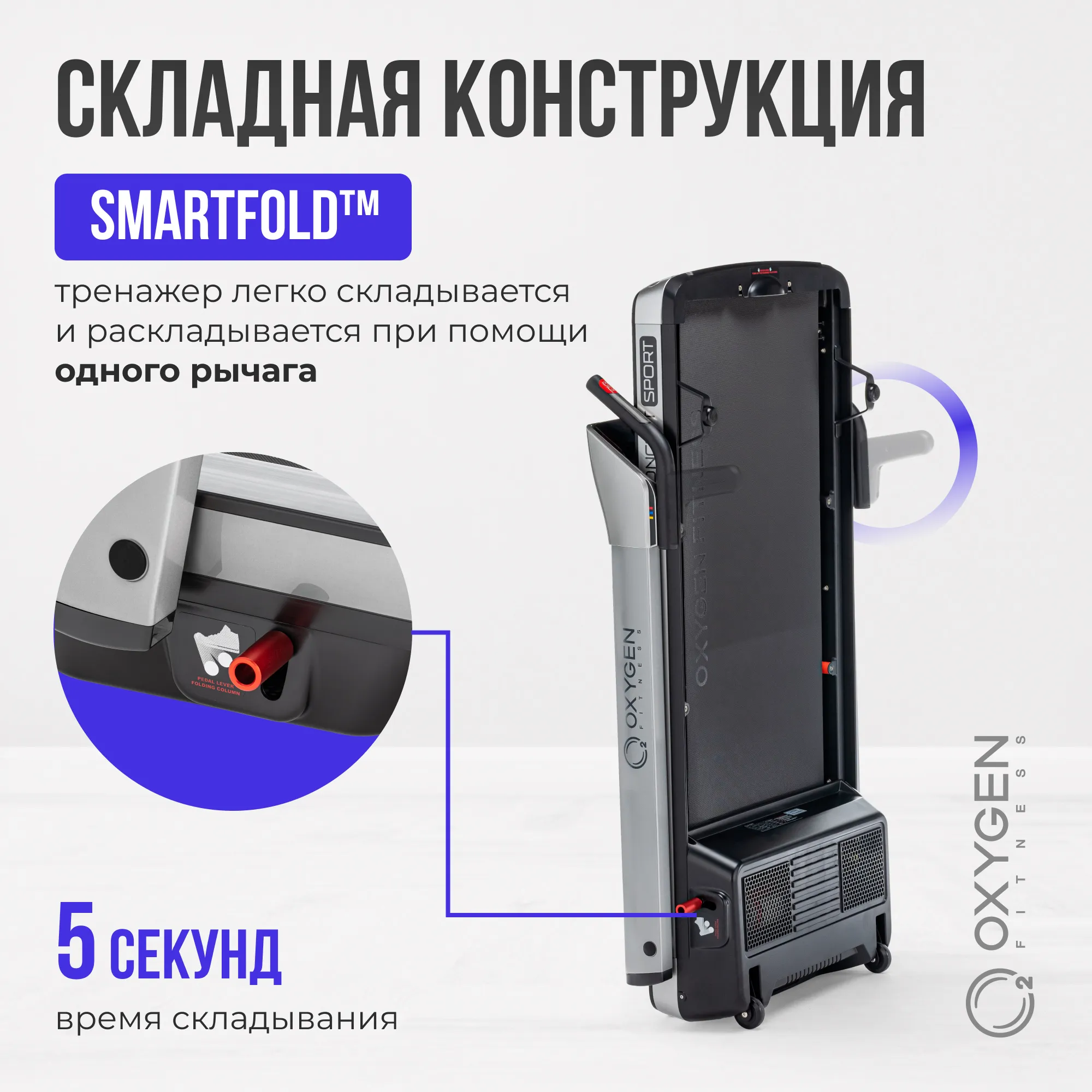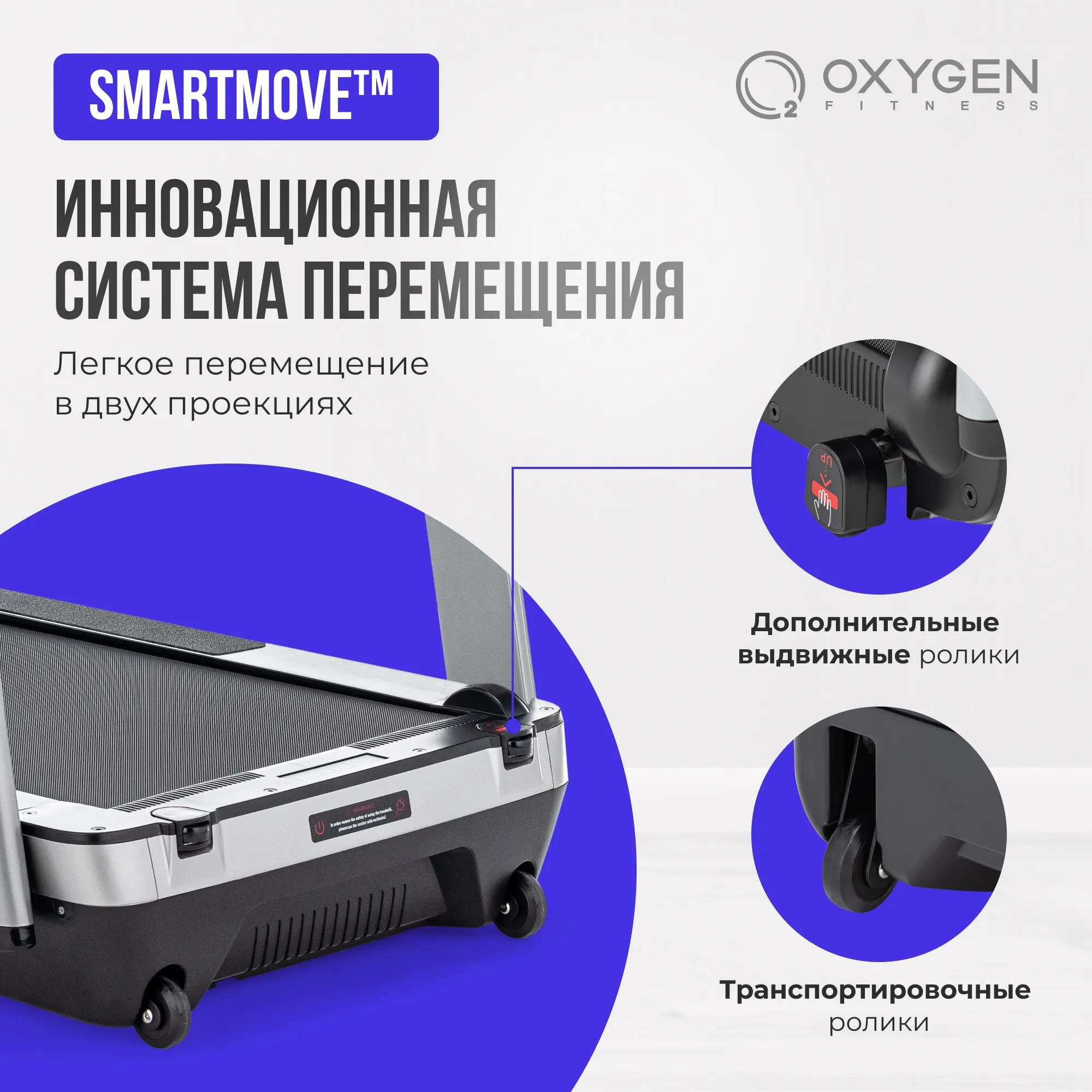 Серия M-Concept - это уникальные тонкие беговые дорожки от OXYGEN FITNESS™. Толщина тренажера в сложенном виде составляет всего 35 см. (или 30 см. при условии снятия небольших поручней). Дорожка легко помещается под кровать, в кладовку или любое другое небольшое место - хранить ее можно и в горизонтальном, и в вертикальном состоянии. Безусловным преимуществом серии является инновационная система перемещения smartMOVE™ - за счет 4 разнонаправленных роликов тренажер можно перемещать в двух проекциях (вперед-назад и вправо-влево) - это очень удобно и, главное, легко в условиях небольших площадей городских квартир. Отдельно стоит выделить другую крайне полезную технологию smartFOLD™ - тренажер складывается и раскладывается простым способом при помощи одного рычага, на весь процесс уйдет не более 5 секунд. Сама дорожка поставляется в уже собранном виде и никакой инструментальной сборки не требует. Ее просто нужно достать из коробки и подключить к розетке.