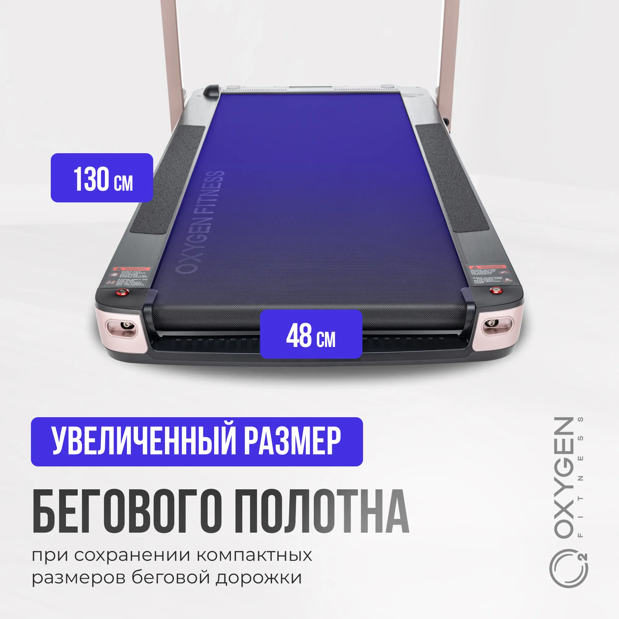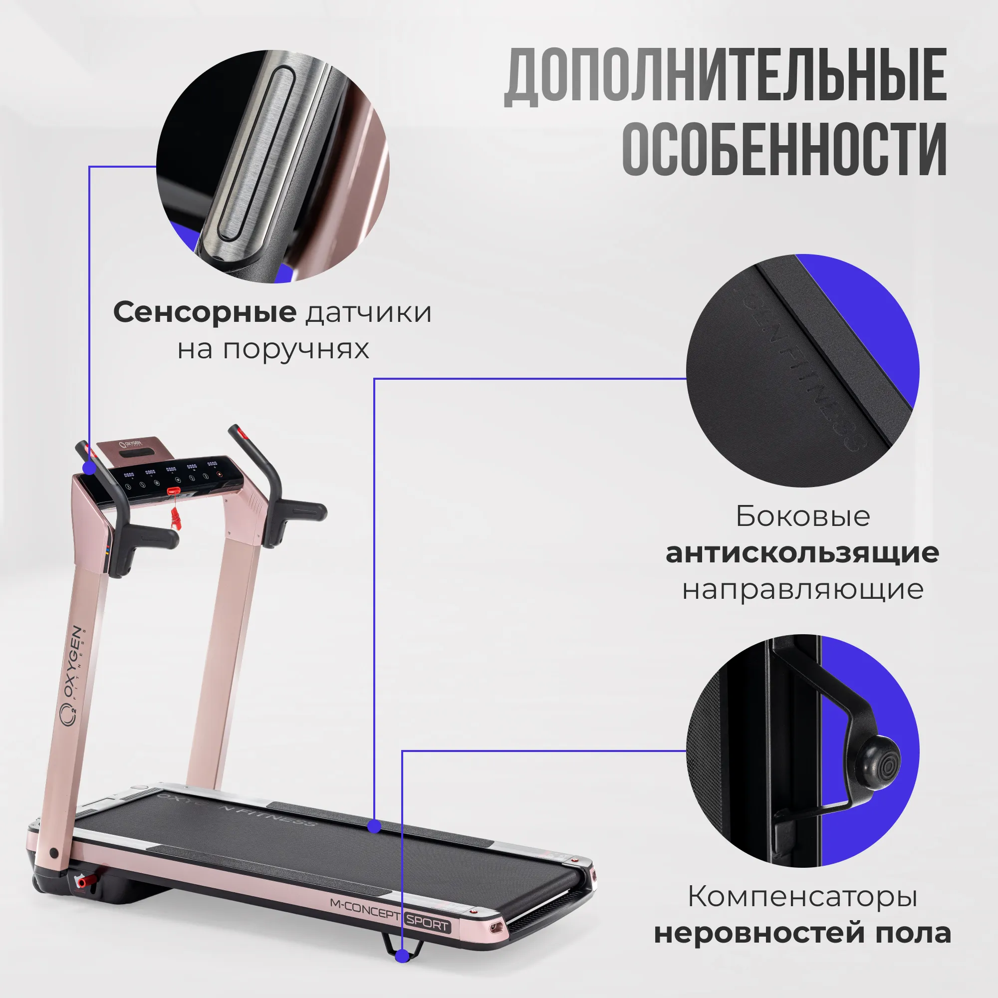 Теперь стоит перейти к главным преимуществам серии M-Concept. Здесь для начала стоит сказать, что практически все ультракомпактные беговые дорожки страдают ограниченным функционалом. Зачастую это вообще чистый маркетинговый продукт, эксплуатирующий желание потребителя заниматься фитнесом в условиях небольшой городской квартиры. Полноценная беговая дорожка по факту "съедает" до 4-ех квадратных метров площади (многие пользователи не складывают дорожку, плюс необходимая зона безопасности вокруг). Соответственно, ради ультракомпактности жертвуется многим - по факту имеем слабые неустойчивые рамы, откровенно маломощные двигатели, скорость до 6 или 8 км./ч., отсутствие амортизации и угла наклона. Некоторые модели не имеют поручней. Ходьба, и тем более бег на таких дорожках достаточно опасен - при небольшой потере равновесия удержаться не за что, и все в итоге может закончиться травмой. В целом, стоит очень внимательно отнестись к покупке ультракомпактной беговой дорожки, объективно оценить плюсы и минусы, понять сможете ли Вы в принципе пользоваться этим изделием. OXYGEN FITNESS™ M-Concept - это принципиально иной подход к компактным беговым дорожкам. Да, возможно, толщина здесь немного больше, чем в ультратонких аналогах. Но это настоящая, полноценная беговая дорожка. На ней можно комфортно и эффективно заниматься, на ней можно достигать реальных результатов в улучшении своей физической формы и, наконец, она безопасна. Итак, давайте посмотрим на характеристики. В M-concept Sport установлен надежный двигатель производства японской Fuji Electric, его мощность составляет 2.25 л.с. в режиме постоянной эксплуатации (или 4.05 л.с. при пиковых нагрузках). Именно мощный двигатель позволяет разогнать полотно до 14 км./ч. Важно, что размер полотна просто огромный для такого компактного тренажера - рабочая беговая поверхность составляет 130 см. в длину и 48 см. в ширину. По второму параметру дорожка вообще приближается к клубному уровню. Более того, в M-Concept Sport есть даже автоматическая регулировка угла наклона от 0 до 12% - за счет чего значительно увеличивается вариативность тренировок. Еще одна ахиллесова пята ультракомпактов - амортизация. По факту ее нет - как бы производитель не доказывал обратное. При такой тонкой раме поставить полноценную систему амортизации невозможно. В серии M-Concept, за счет большей толщины рамы, вопрос решен радикально - здесь стоят сразу 6 профессиональных эластомеров VCS™. Это именно та амортизация, которая устанавливается на профессиональные беговые дорожки.