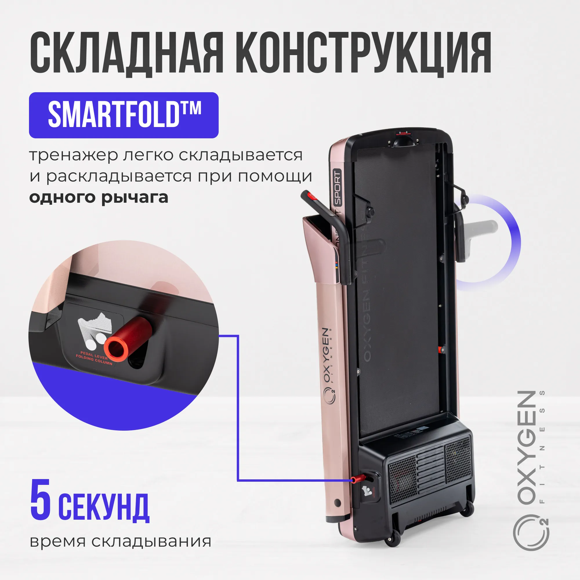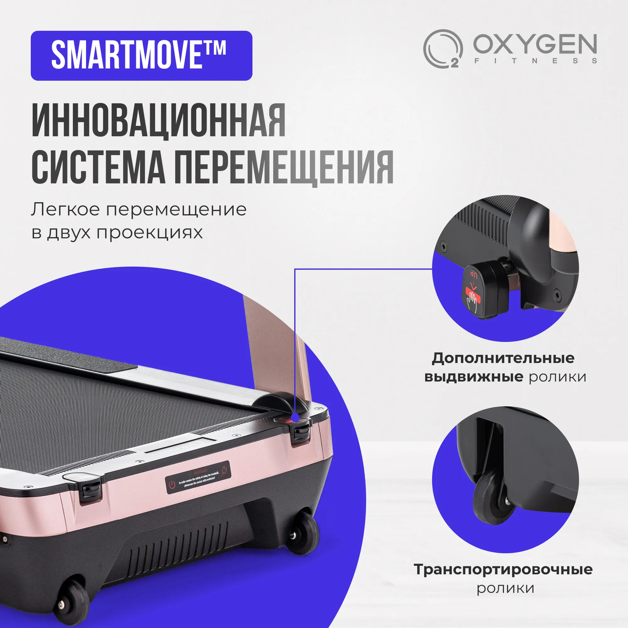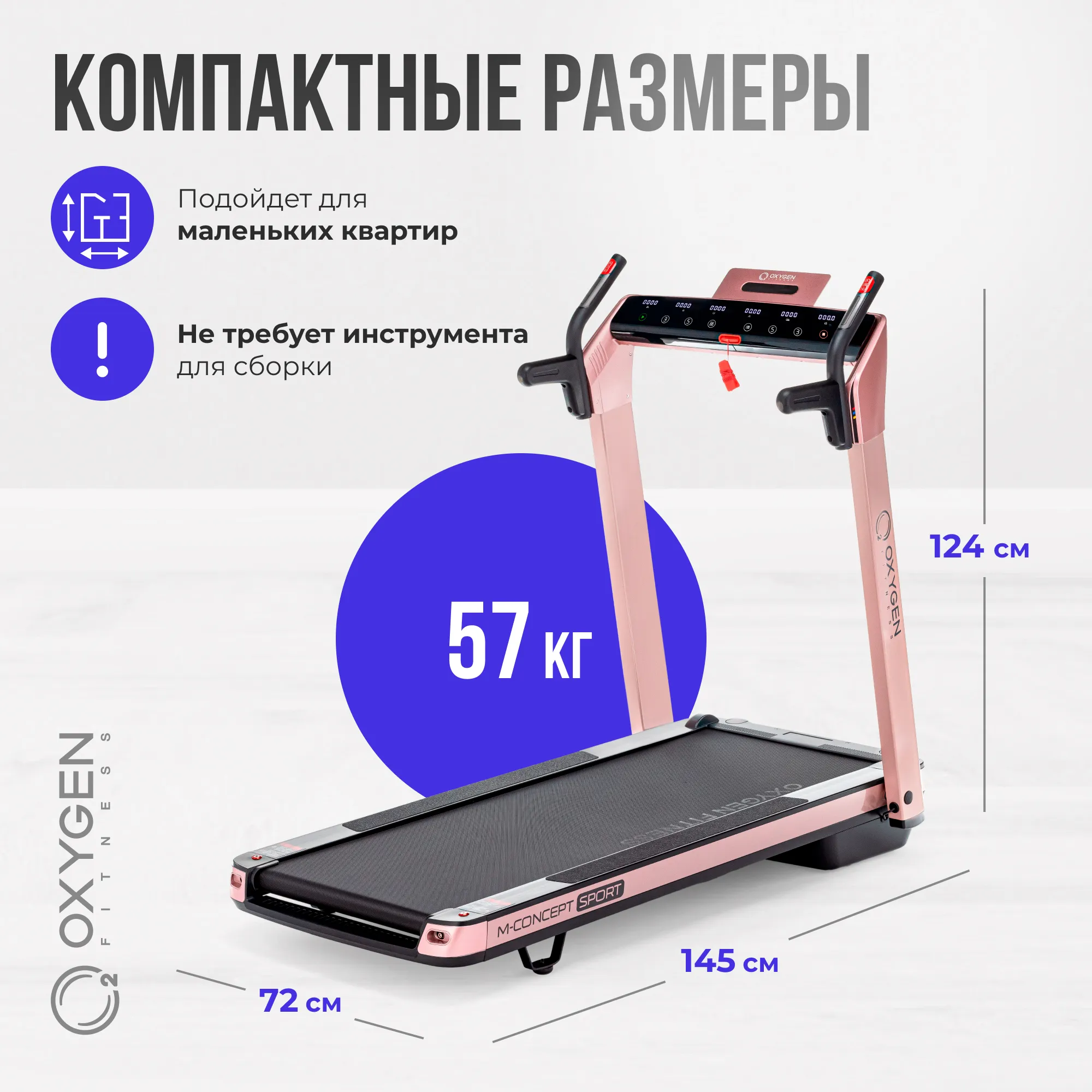 Серия M-Concept - это уникальные тонкие беговые дорожки от OXYGEN FITNESS™. Толщина тренажера в сложенном виде составляет всего 35 см. (или 30 см. при условии снятия небольших поручней). Дорожка легко помещается под кровать, в кладовку или любое другое небольшое место - хранить ее можно и в горизонтальном, и в вертикальном состоянии. Безусловным преимуществом серии является инновационная система перемещения smartMOVE™ - за счет 4 разнонаправленных роликов тренажер можно перемещать в двух проекциях (вперед-назад и вправо-влево) - это очень удобно и, главное, легко в условиях небольших площадей городских квартир. Отдельно стоит выделить другую крайне полезную технологию smartFOLD™ - тренажер складывается и раскладывается простым способом при помощи одного рычага, на весь процесс уйдет не более 5 секунд. Сама дорожка поставляется в уже собранном виде и никакой инструментальной сборки не требует. Ее просто нужно достать из коробки и подключить к розетке.