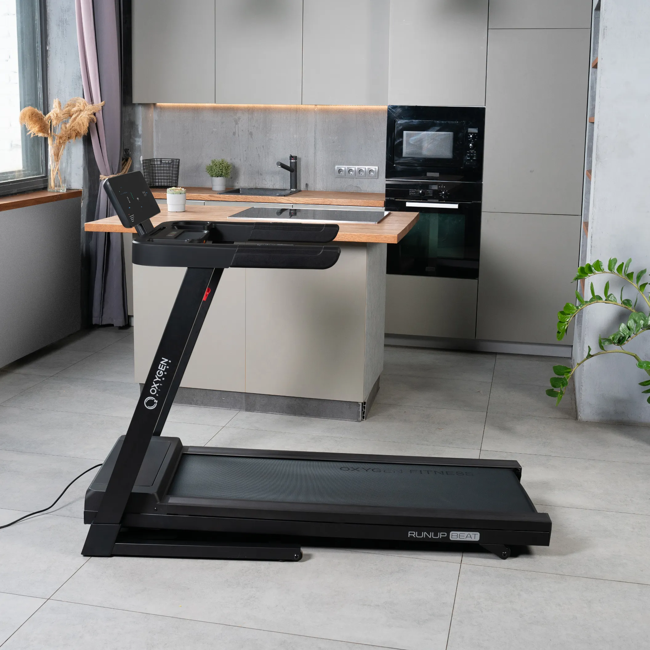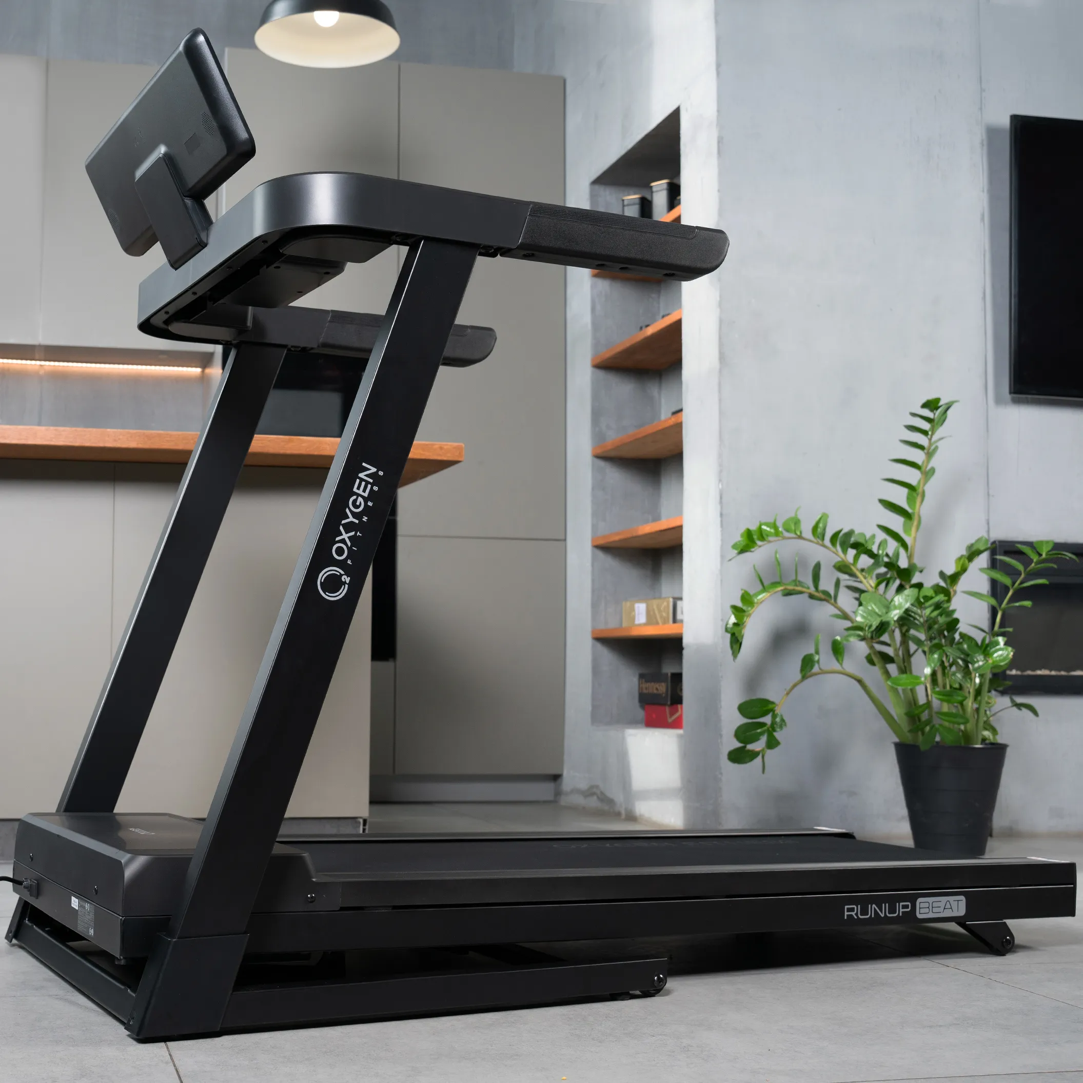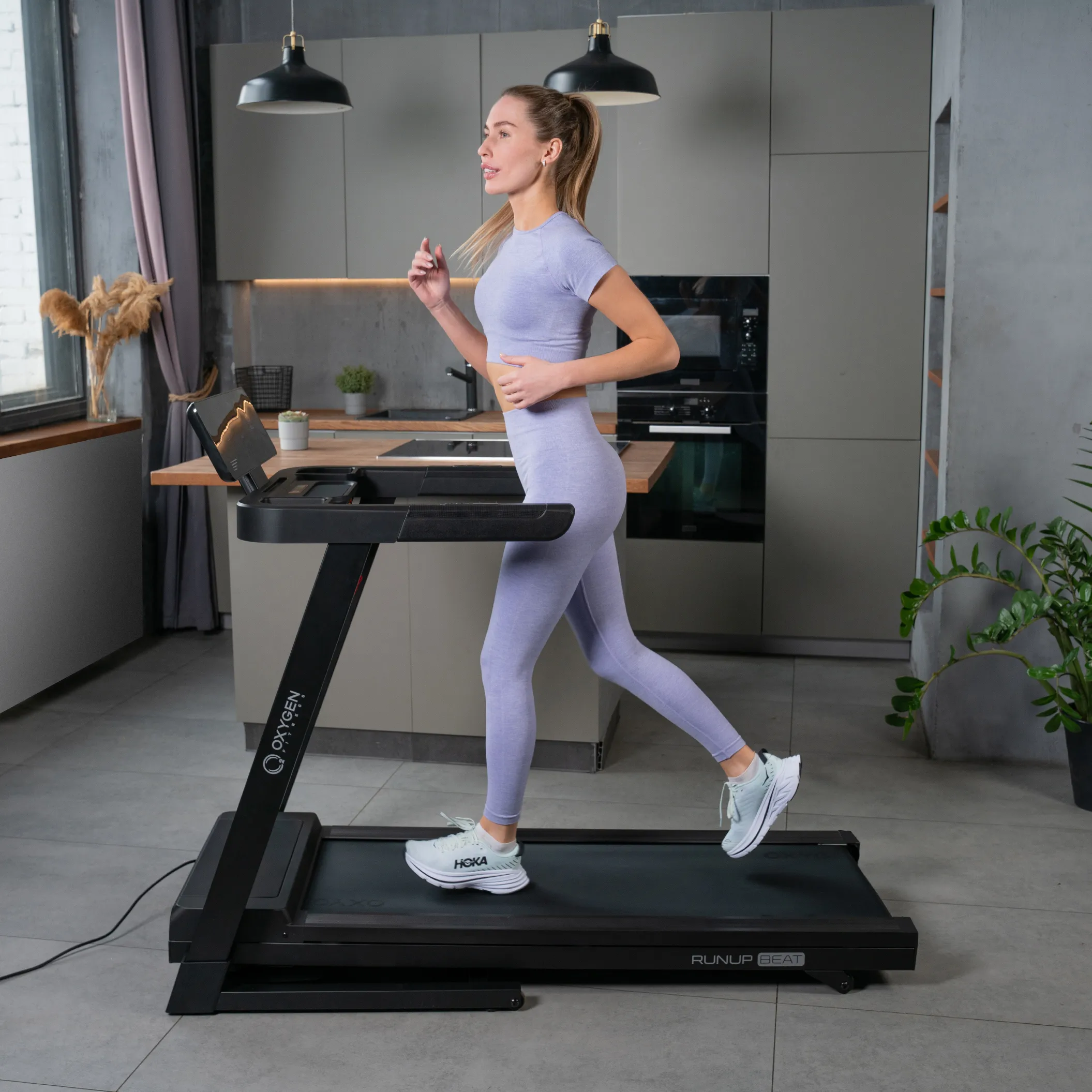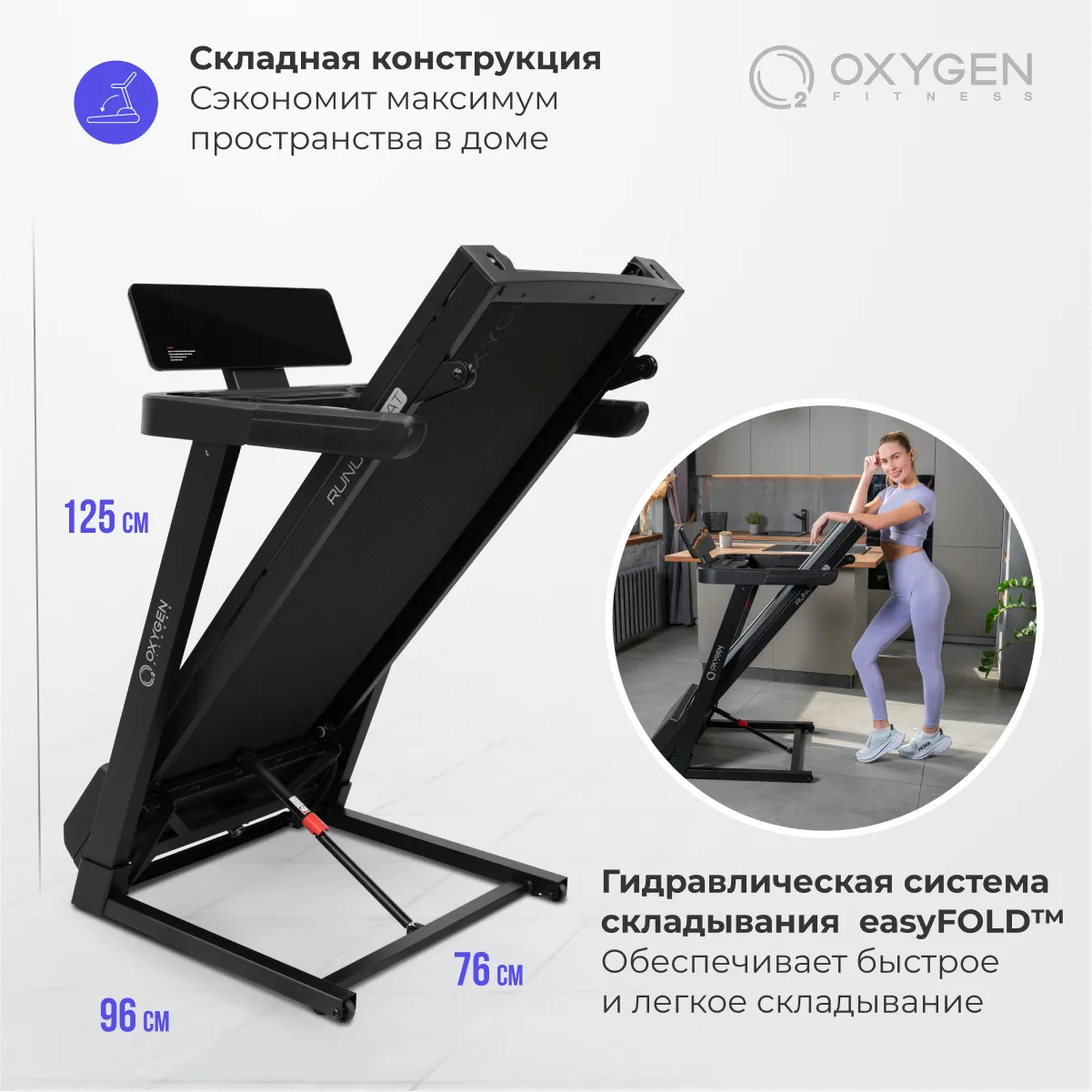 Серия беговых дорожек OXYGEN FITNESS RUNUP сочетает в себе простоту, функциональность и комфорт. Тренажеры отличаются современным строгим дизайном, выполненным в элегантной цветовой гамме. Кроме аккуратно состыкованных поверхностей и гармоничного баланса металлических и пластиковых материалов, в серии RUNUP нет ничего лишнего. Моторный отсек является продолжением рамы деки, находится с ней на одном уровне и выглядит как единое целое. Такое решение придает не только эстетическую законченность форм, но и является одним из важных факторов, позволяющим уменьшить размер тренажера.