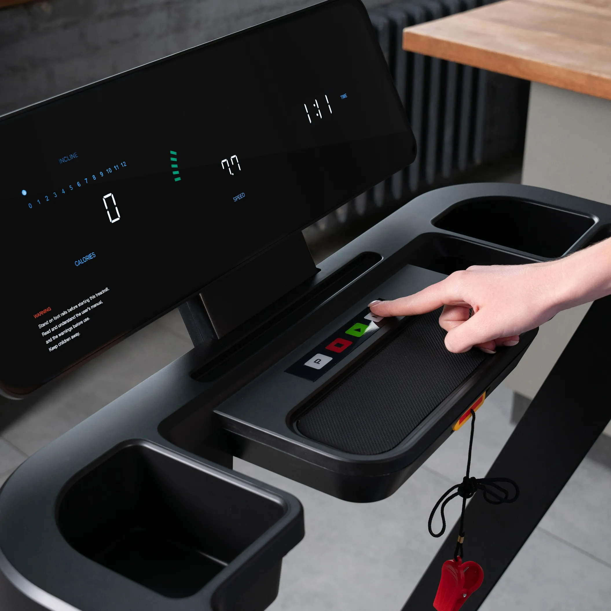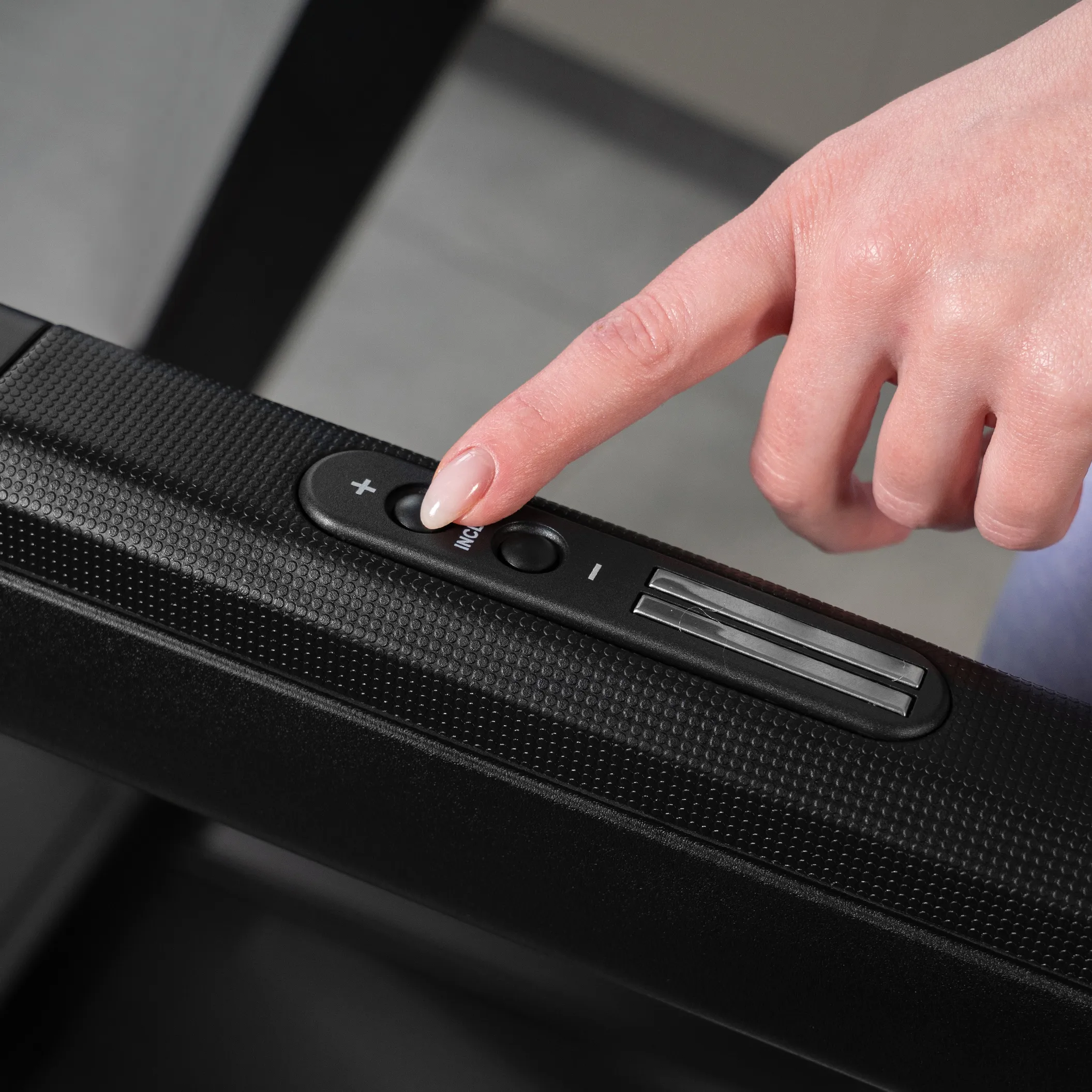 BEAT имеет весь необходимый набор для проведения эффективных тренировок. Информативная консоль с яркими, буквенно-цифровыми LED-дисплеями, отображает следующие показатели: время, скорость, наклон, дистанция, калории, пульс, жироанализатор. Все показатели изменяются при помощи сенсорных кнопок. В памяти консоли содержится 47 программ. Сделать упор на конкретный показатель можно при помощи режима целевых тренировок (дистанция, калории, время). Помимо установленных программ, можно воспользоваться регулируемым ручным режимом. Дополнительно есть подставка под планшет и отсек для бутылочки.