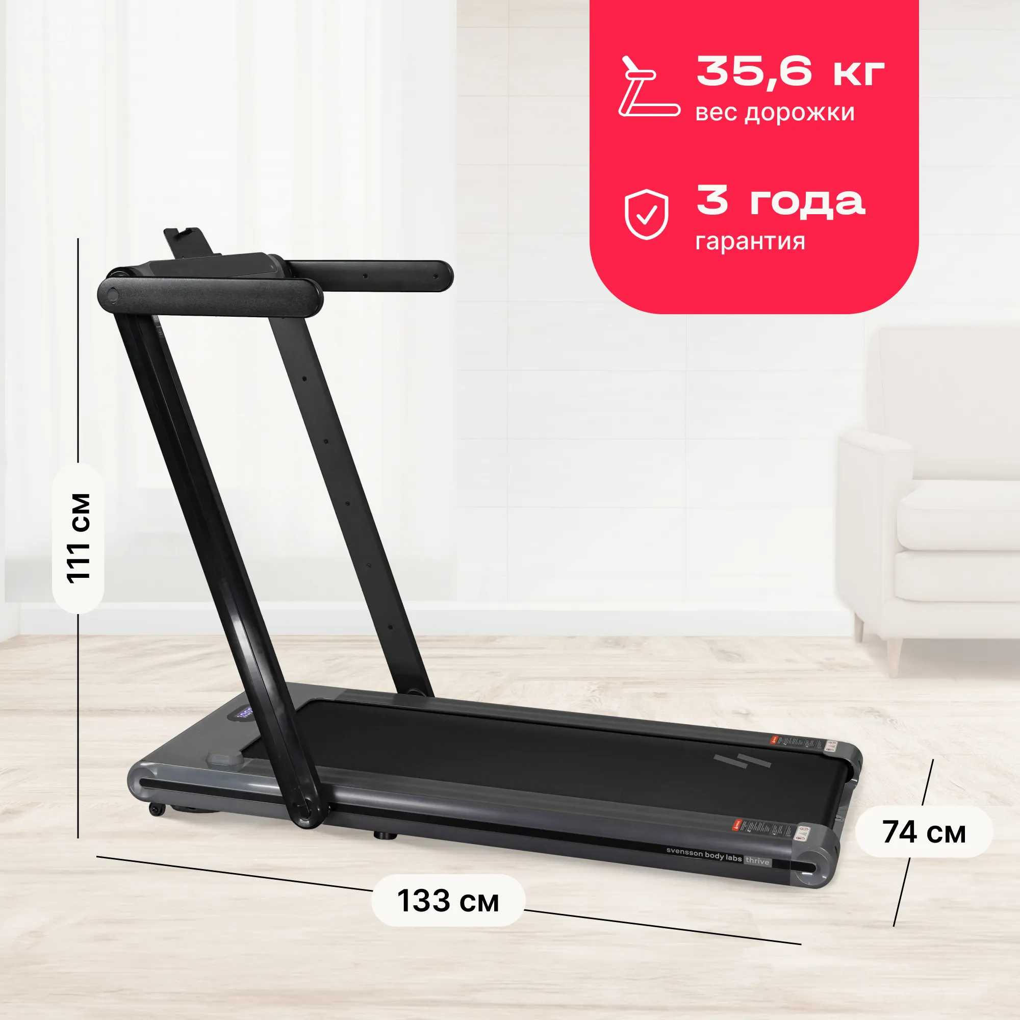 Беговая дорожка SVENSSON BODY LABS THRIVE — это отличный выбор для тех, кто хочет поддерживать активный образ жизни, не выходя из дома. С мощным двигателем 2,0 л.с. (пиковая мощность 3,0 л.с.) и возможностью регулировки скорости от 1 до 16 км/ч, данная модель подходит как для начинающих, так и для опытных бегунов. Беговое полотно шириной 40 см и длиной 111 см обеспечивает комфортное пространство для занятий, что позволяет сосредоточиться на тренировках.