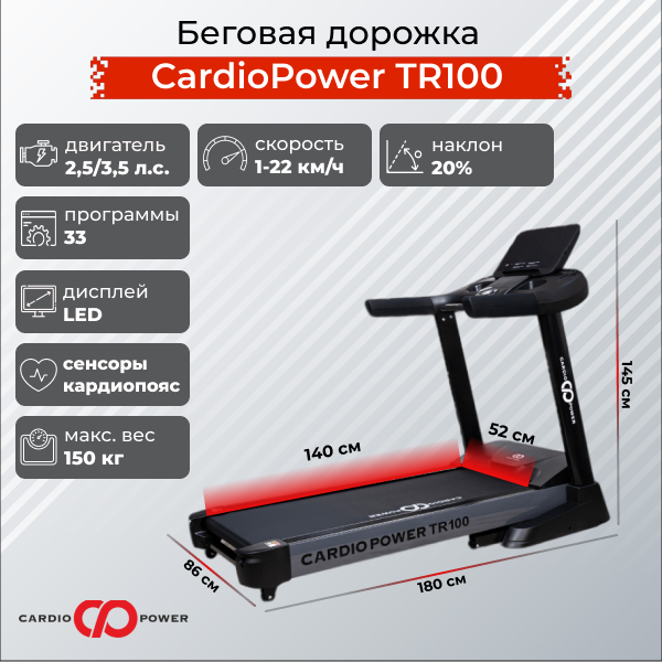 Беговая дорожка CardioPower TR100 имеет современный и стильный дизайн, удобную эргономику, и продвинутый функционал для самых эффективных тренировок в домашних условиях.