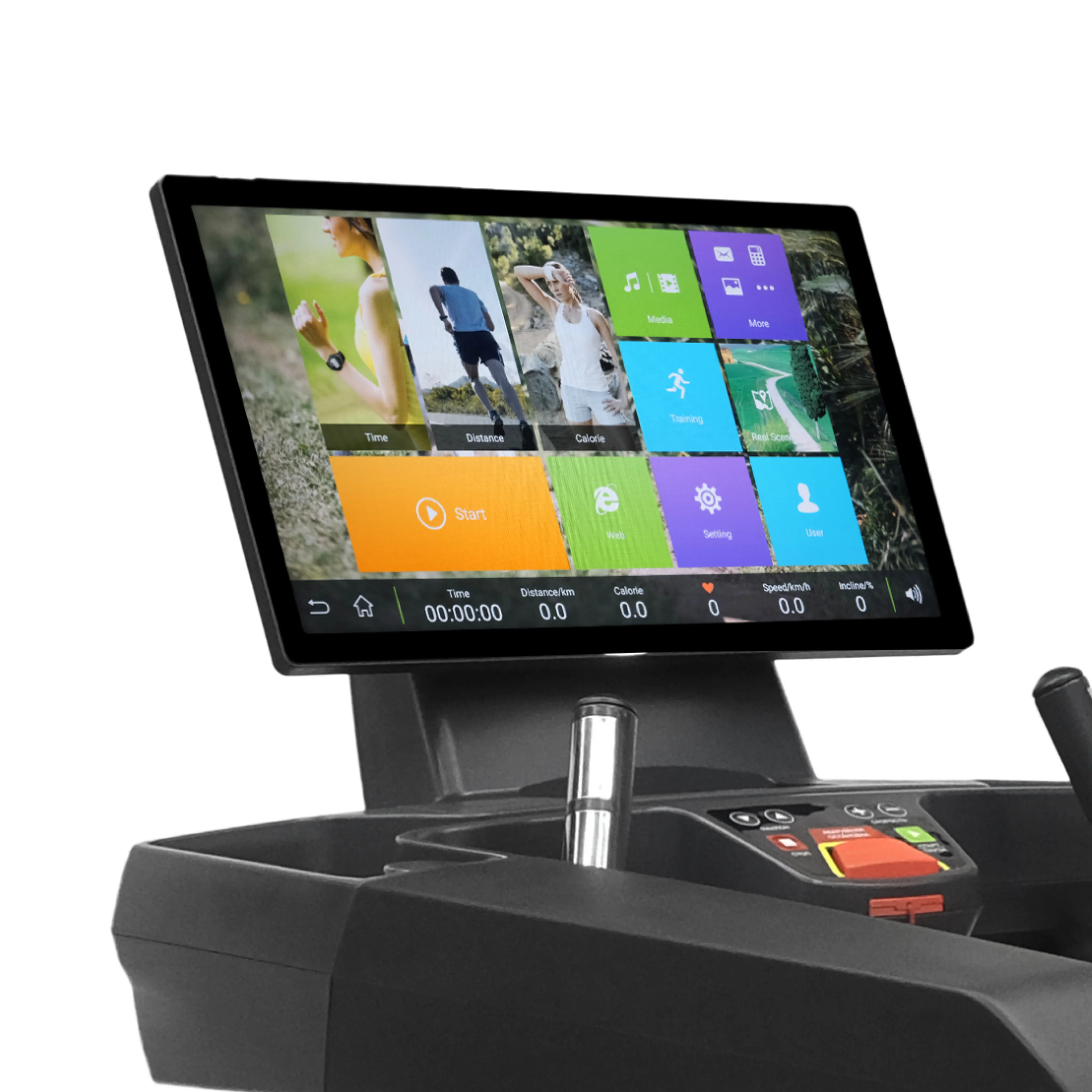 Тренировочный компьютер T1000M PRO TFT TURBO представлен 23.8-дюймовым сенсорным TFT-дисплеем. Для удобства управления все клавиши русифицированы. На экран компьютера выводятся все основные данные – программный профиль, время, скорость, дистанция, расход калорий, пульс, угол наклона, шаги. Расширенный программный пакет насчитывает 44 режима программ, предназначенных для достижения самых разных спортивных целей.