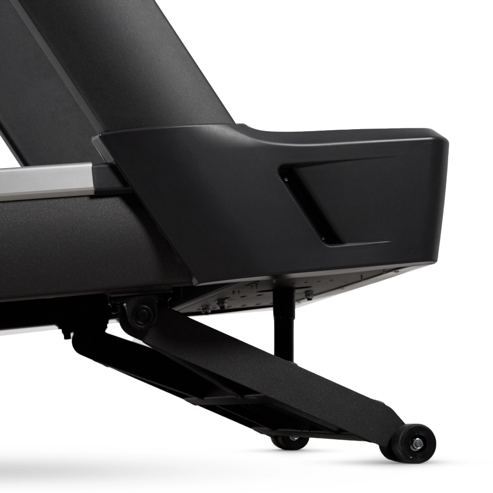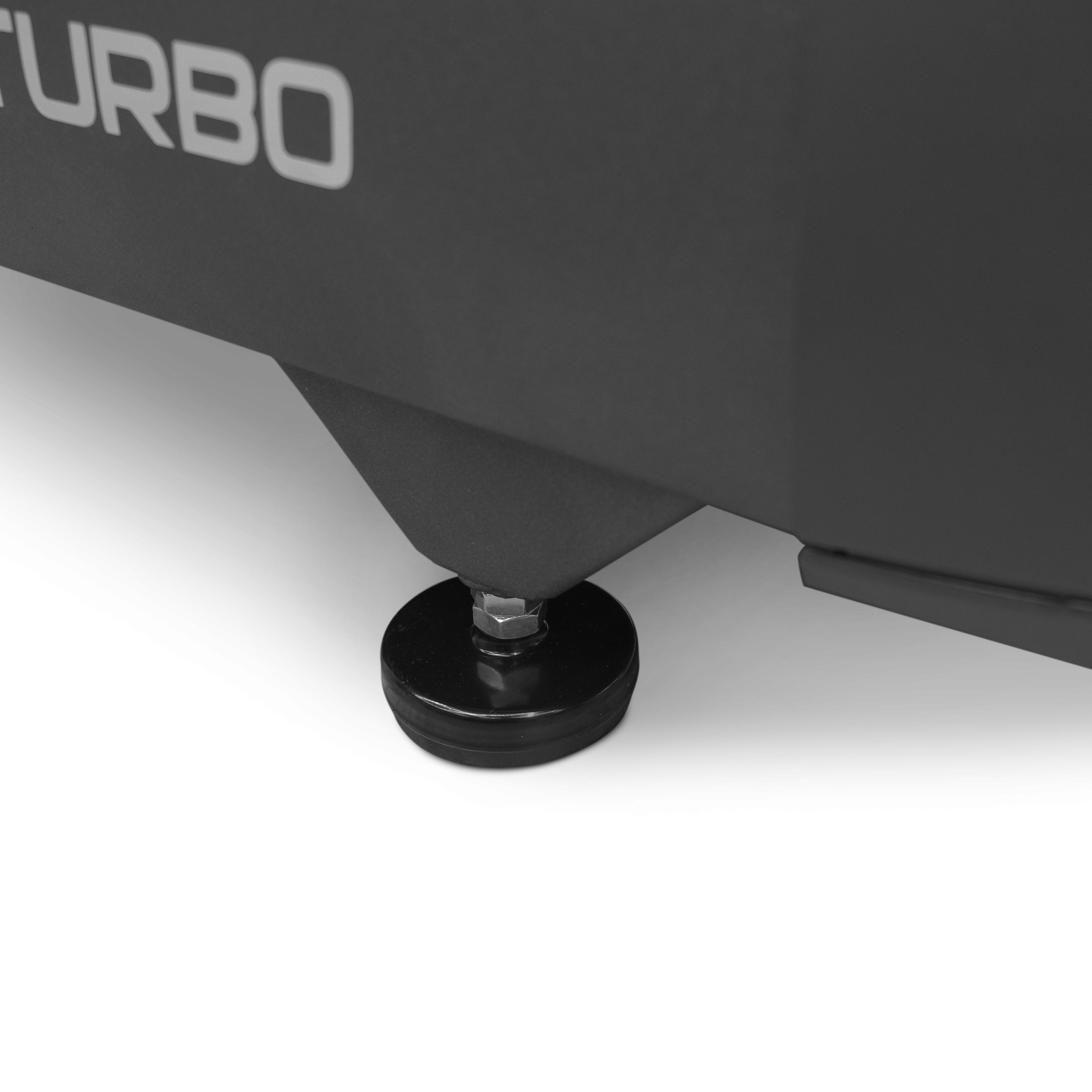 В основе конструкции – высокопрочная рама с двухслойной покраской. Вес изделия составляет 198 кг и способен выдерживать нагрузку до 180 кг. Беговая дорожка идеально подойдет для любителей высокоэффективных тренировок и профессиональных спортсменов. Чтобы удовлетворить самые высокие потребности, под капотом T1000M PRO TFT TURBO расположен двигатель мощностью 6 л.с. (в режиме пиковых нагрузок 8,5 л.с.). Оборудование способно развивать скорость до 25 км/ч, а угол наклона изменяется электрическим способом в 15 положениях. Для улучшения качества тренировочного процесса и его разнообразия на T1000M PRO TFT TURBO установлено ортопедическое полотно профессионального класса (толщина 2,5 мм) с огромной беговой зоной размером 162*60 см. Для сокращения нагрузки на суставы модель оснащена амортизационной системой на базе эластомеров и подушек, расположенных по периметру полотна.